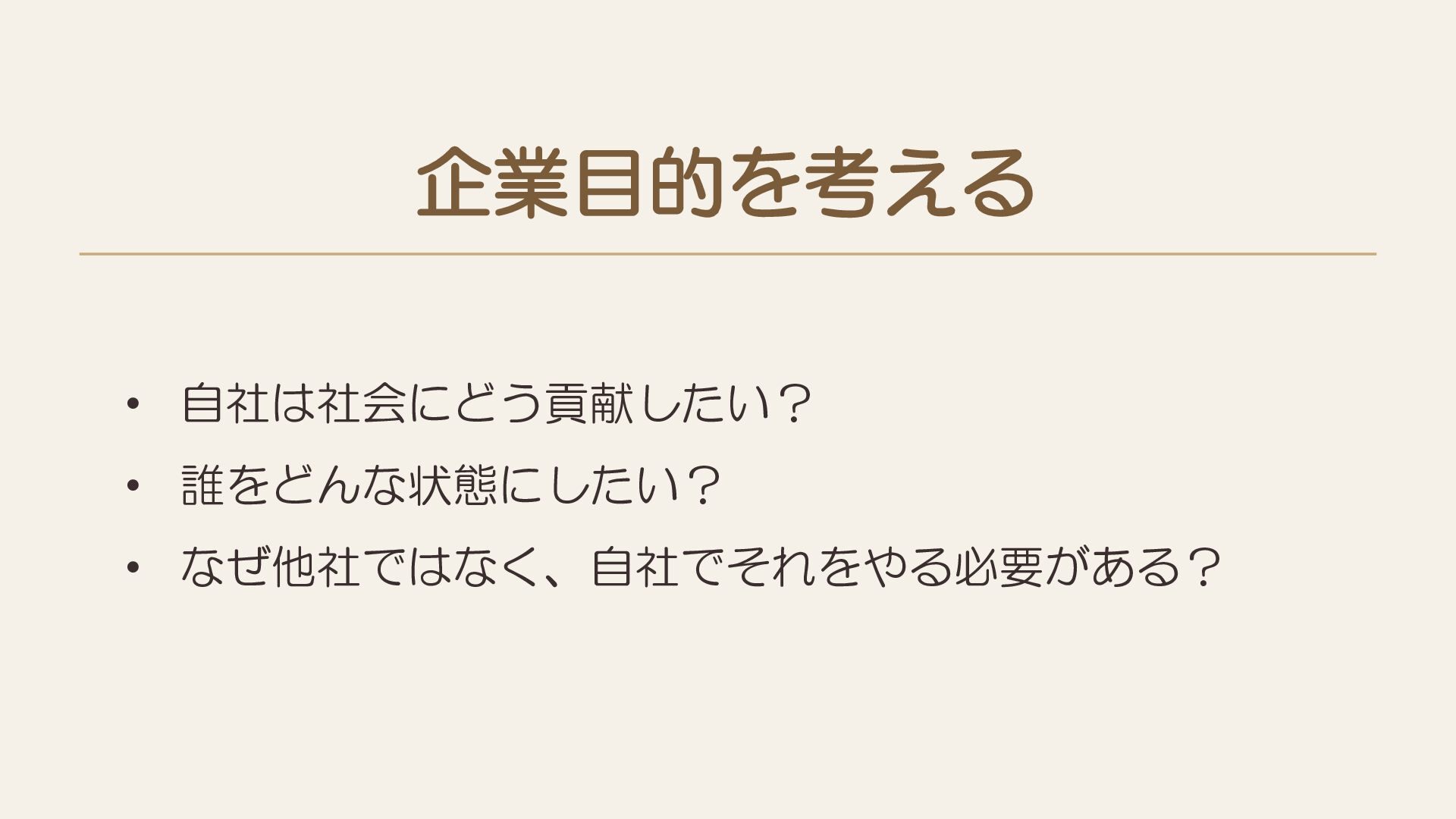 企業目的を考える • 自社は社会にどう貢献したい? • 誰をどんな状態にしたい? • なぜ他社ではなく、自社でそれをやる必要がある?