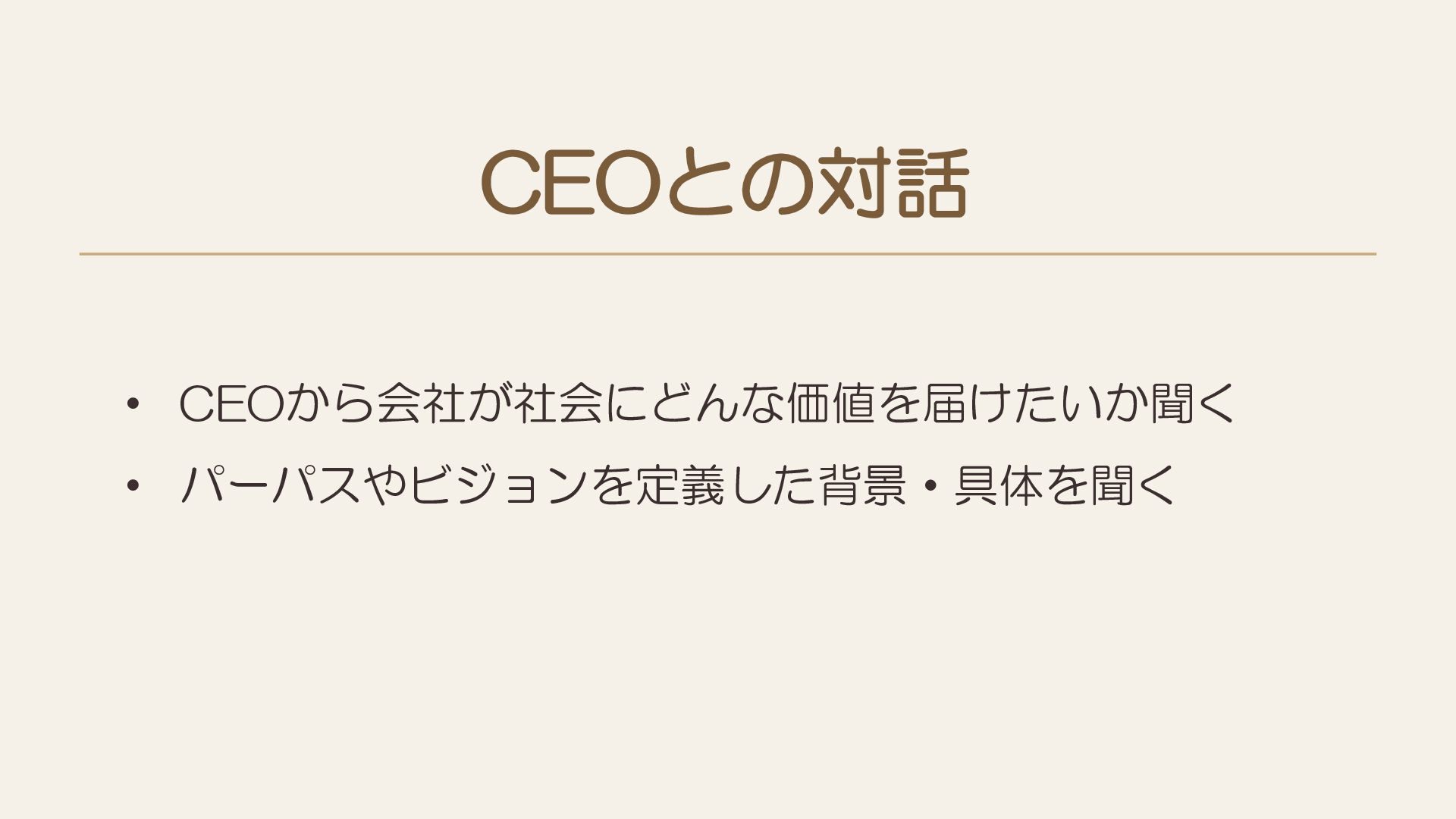 CEOとの対話 • CEOから会社が社会にどんな価値を届けたいか聞く • パーパスやビジョンを定義した背景・具体を聞く
