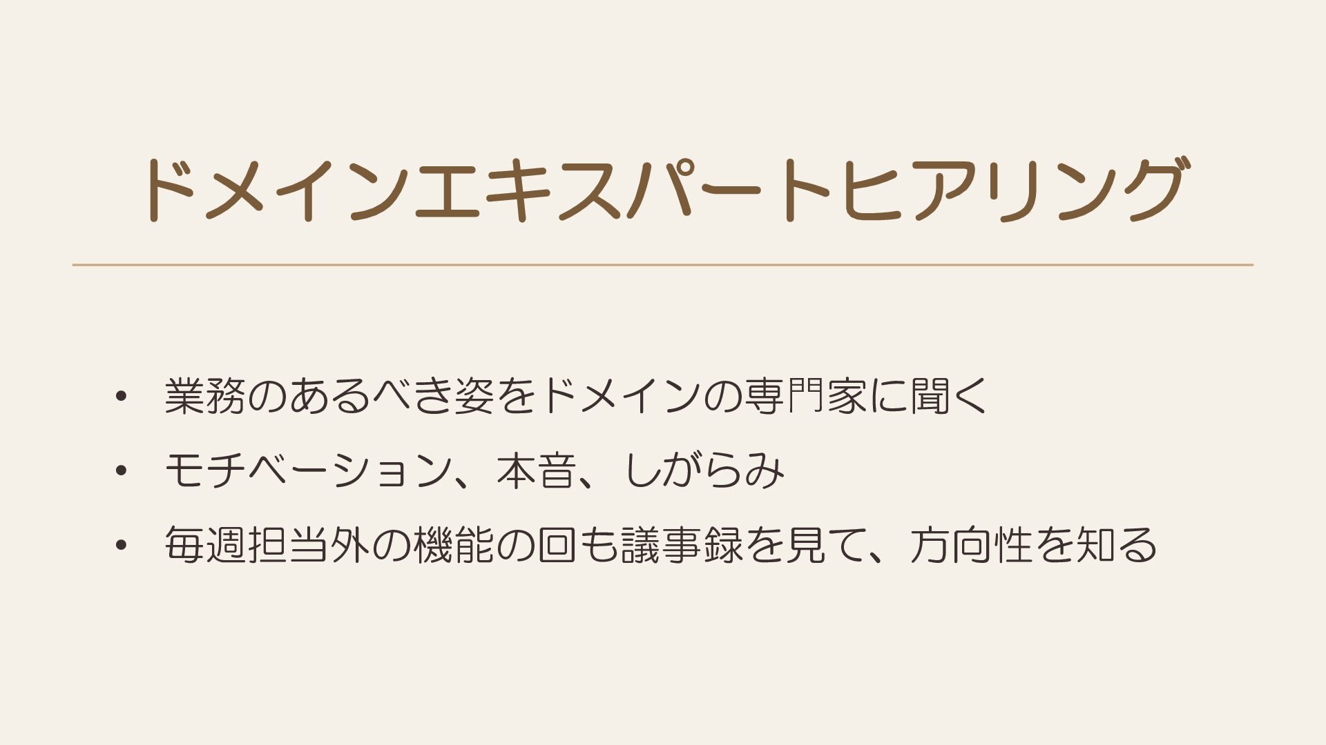 ドメインエキスパートヒアリング • 業務のあるべき姿をドメインの専⾨家に聞く • モチベーション、本音、しがらみ • 毎週担当外の機能の回も議事録を見て、方向性を知る