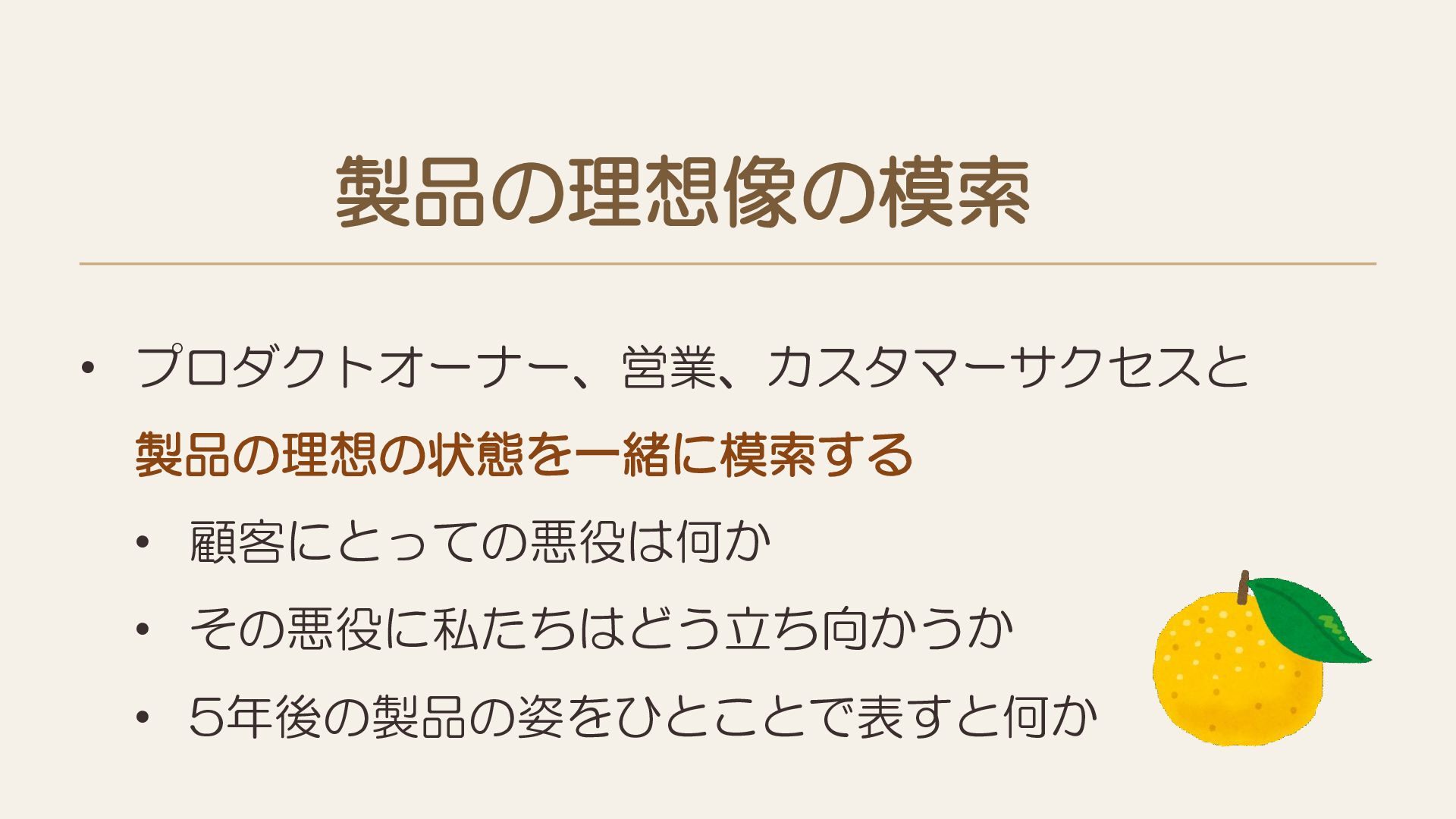 製品の理想像の模索 • プロダクトオーナー、営業、カスタマーサクセスと 製品の理想の状態を⼀緒に模索する • 顧客にとっての悪役は何か • その悪役に私たちはどう立ち向かうか • 5年後の製品の姿をひとことで表すと何か