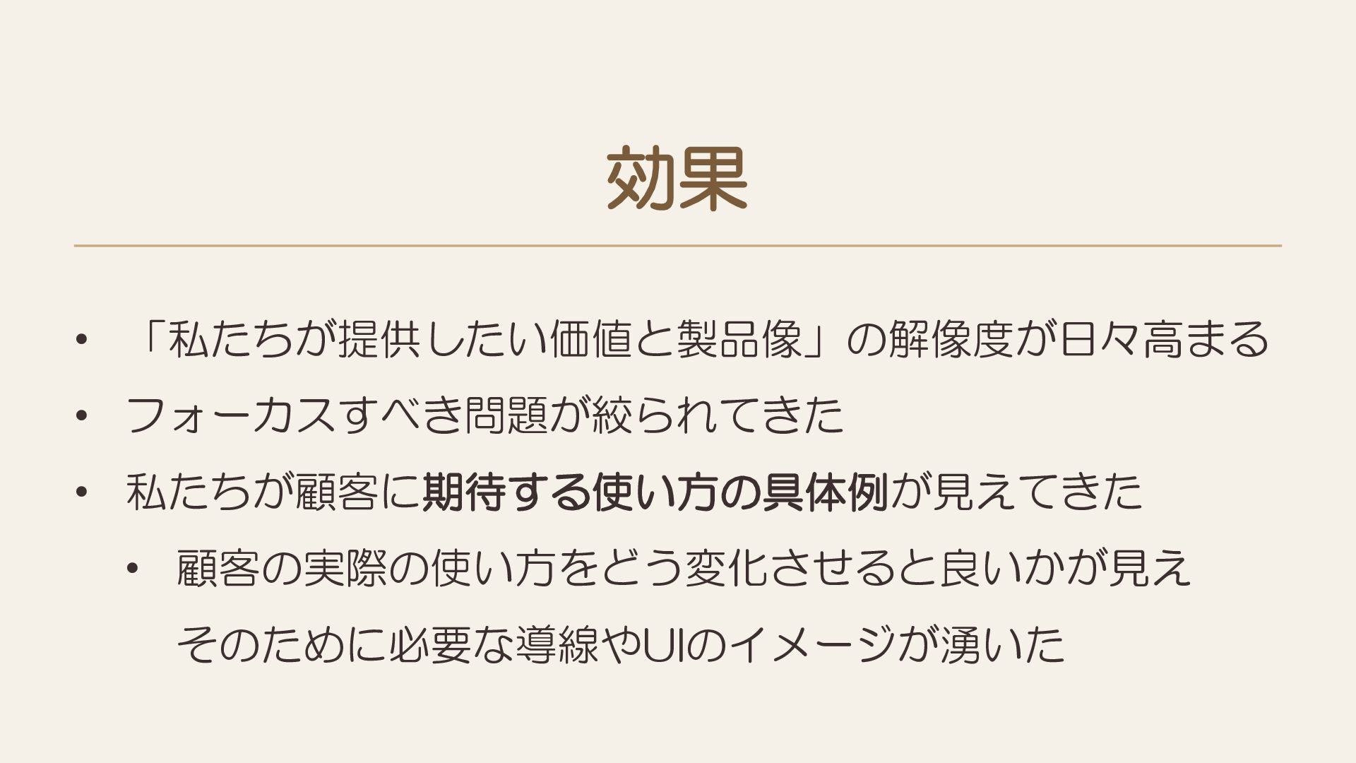 効果 • 「私たちが提供したい価値と製品像」の解像度が日々高まる • フォーカスすべき問題が絞られてきた • 私たちが顧客に期待する使い方の具体例が見えてきた • 顧客の実際の使い方をどう変化させると良いかが見え そのために必要な導線やUIのイメージが湧いた