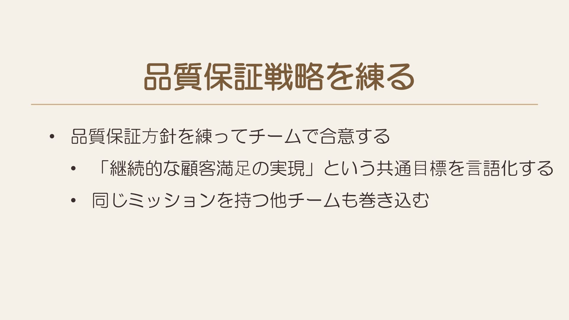 品質保証戦略を練る • 品質保証⽅針を練ってチームで合意する • 「継続的な顧客満⾜の実現」という共通⽬標を⾔語化する • 同じミッションを持つ他チームも巻き込む