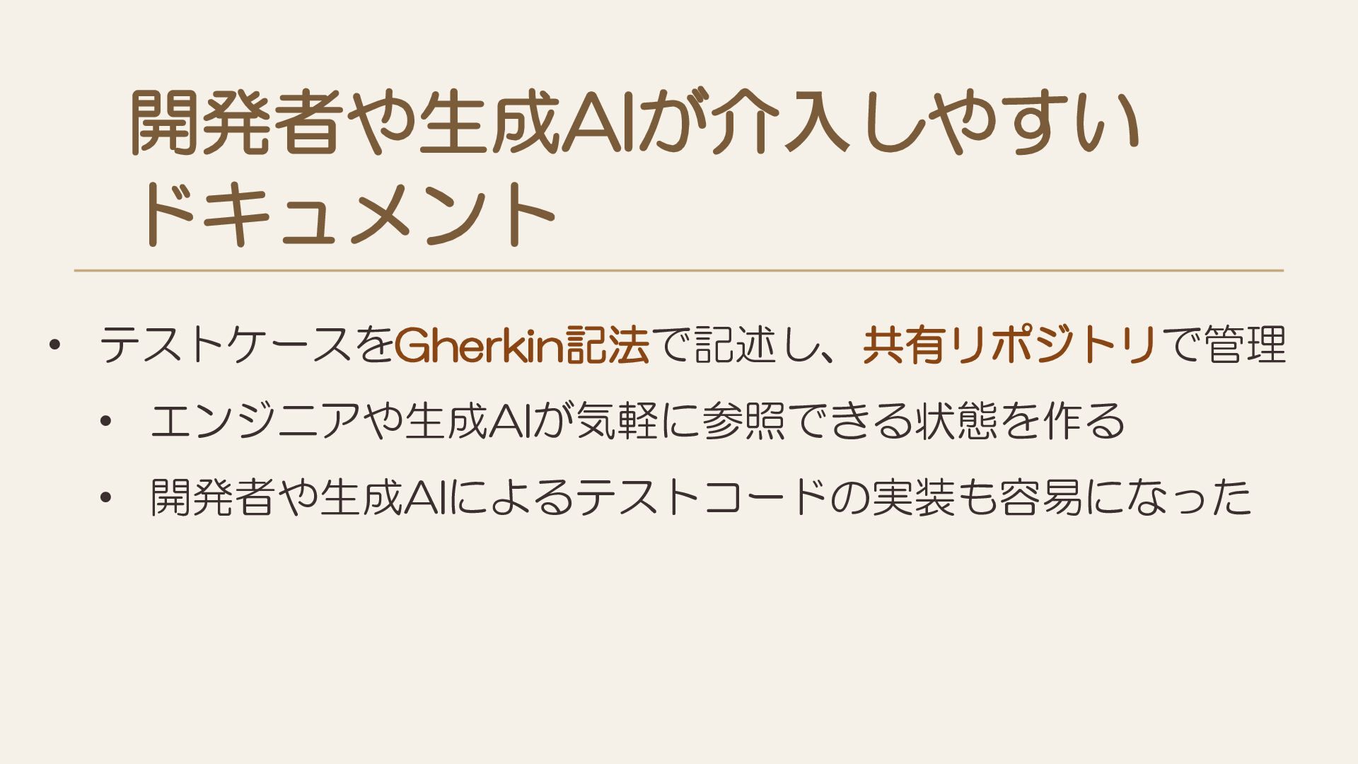 開発者や生成AIが介⼊しやすい ドキュメント • テストケースをGherkin記法で記述し、共有リポジトリで管理 • エンジニアや生成AIが気軽に参照できる状態を作る • 開発者や生成AIによるテストコードの実装も容易になった