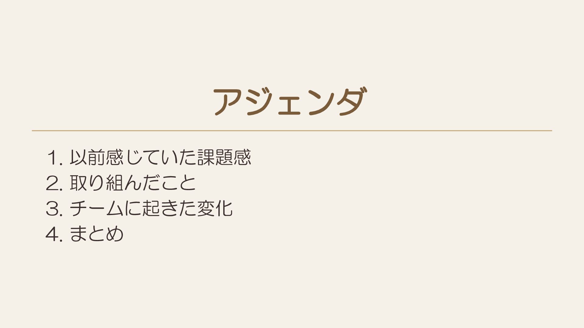 アジェンダ 1. 以前感じていた課題感 2. 取り組んだこと 3. チームに起きた変化 4. まとめ