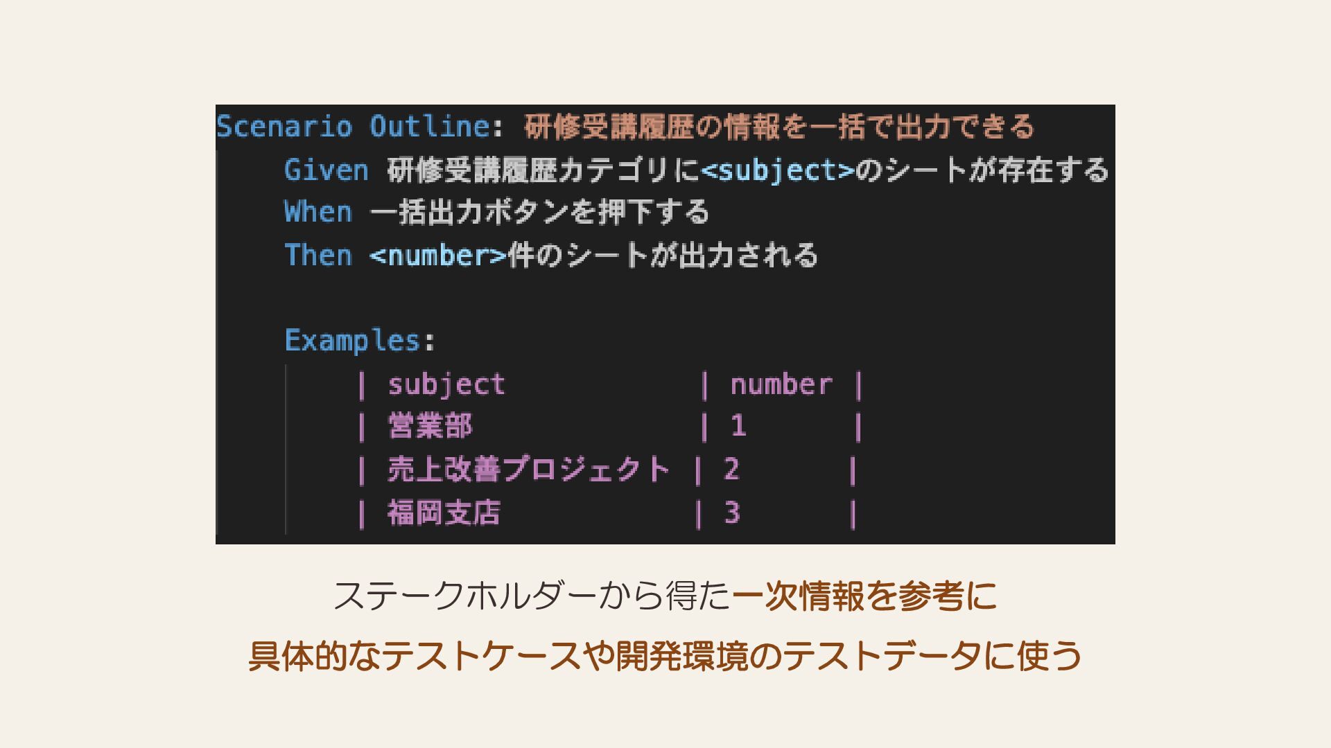 ステークホルダーから得た⼀次情報を参考に 具体的なテストケースや開発環境のテストデータに使う