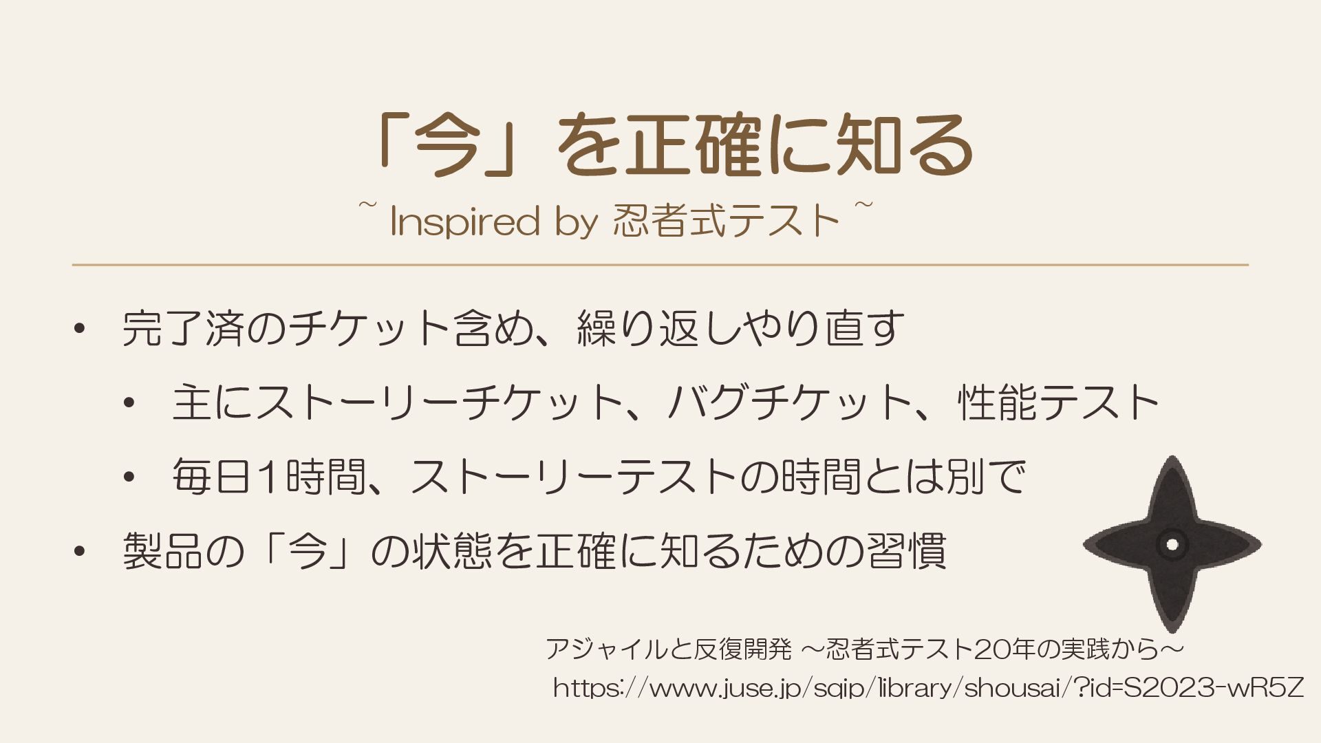 Inspired by 忍者式テスト ~ アジャイルと反復開発 ~忍者式テスト20年の実践から~ https://www.juse.jp/sqip/library/shousai/?id=S2023-wR5Z