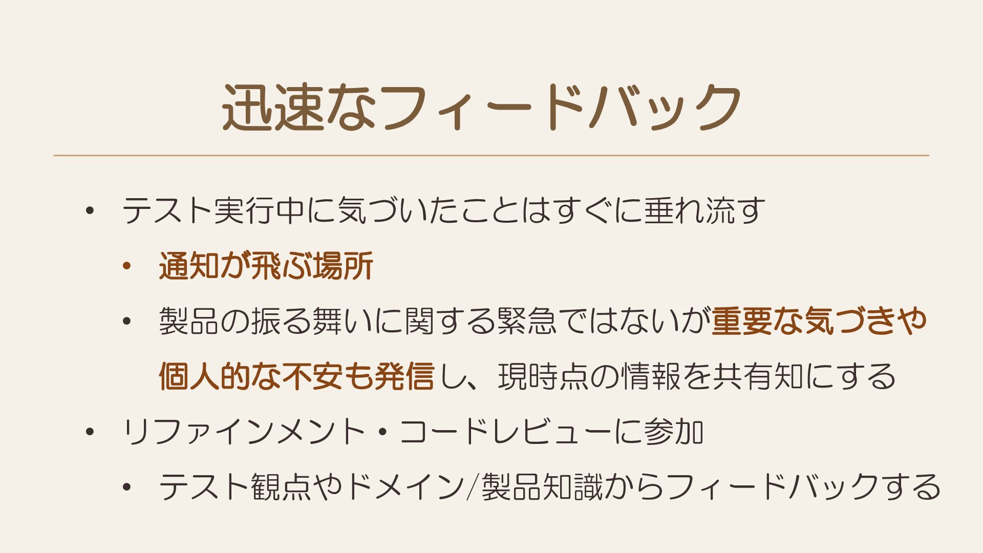 迅速なフィードバック • テスト実行中に気づいたことはすぐに垂れ流す • 通知が飛ぶ場所 • 製品の振る舞いに関する緊急ではないが重要な気づきや 個人的な不安も発信し、現時点の情報を共有知にする • リファインメント・コードレビューに参加