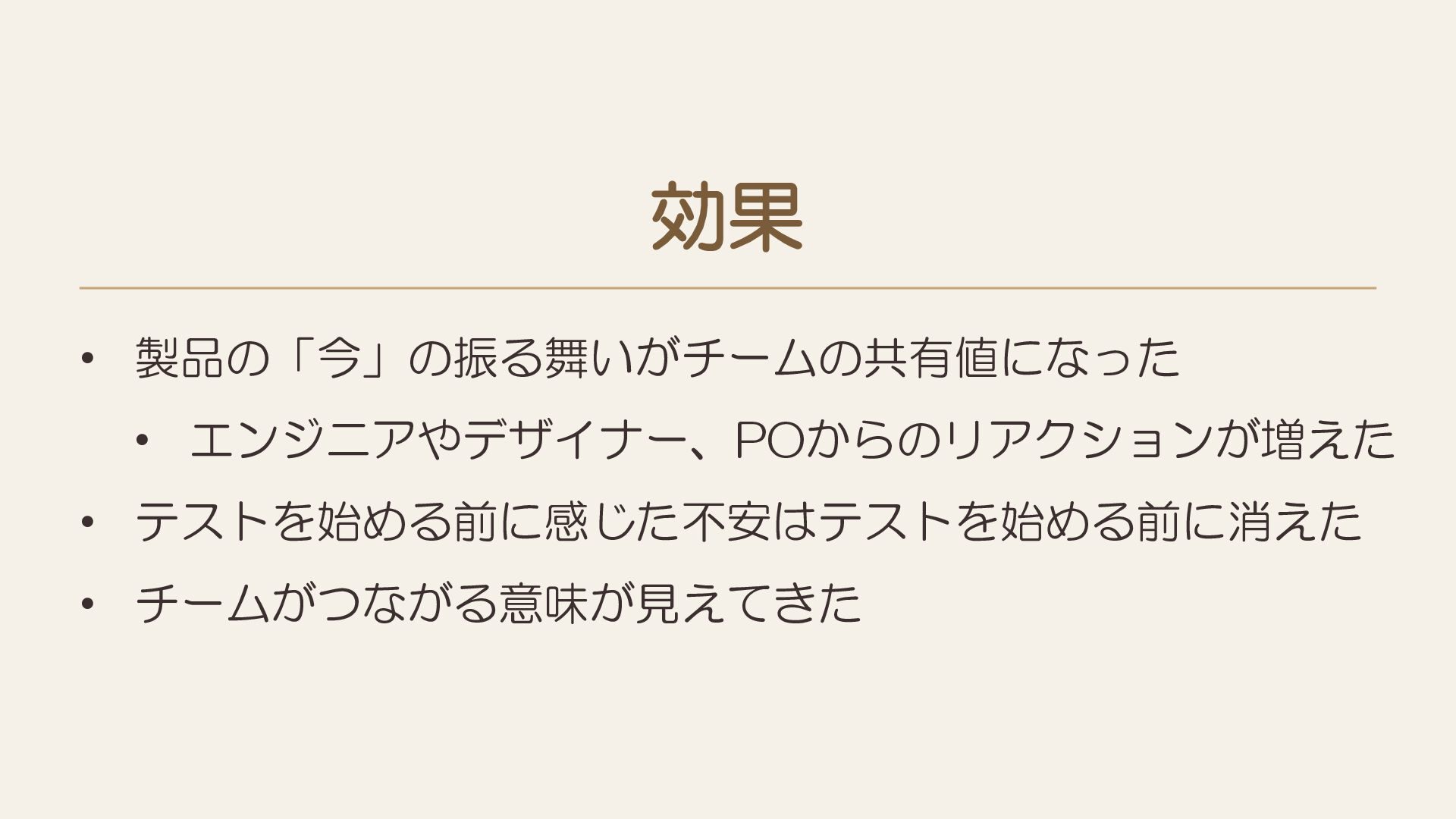 効果 • 製品の「今」の振る舞いがチームの共有値になった • エンジニアやデザイナー、POからのリアクションが増えた • テストを始める前に感じた不安はテストを始める前に消えた • チームがつながる意味が見えてきた