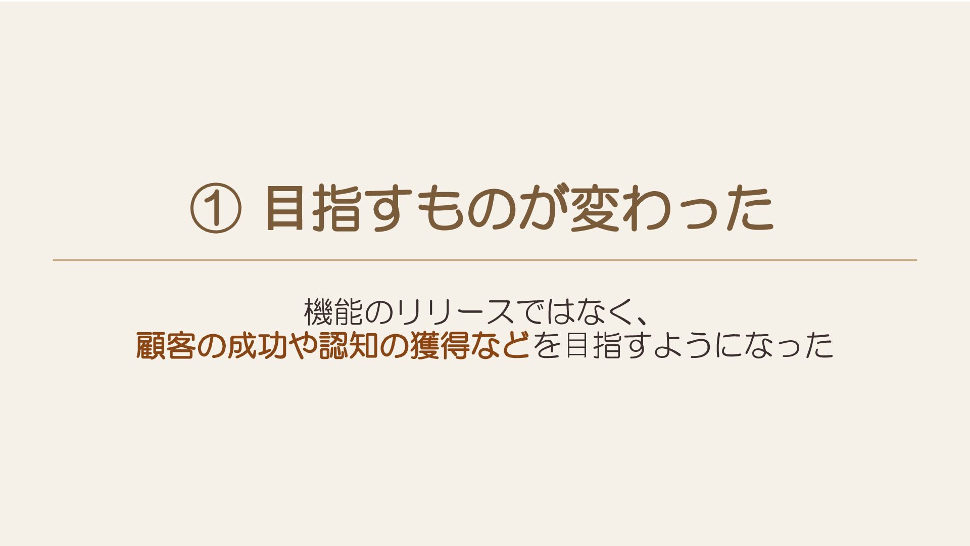 ① ⽬指すものが変わった 機能のリリースではなく、 顧客の成功や認知の獲得などを⽬指すようになった