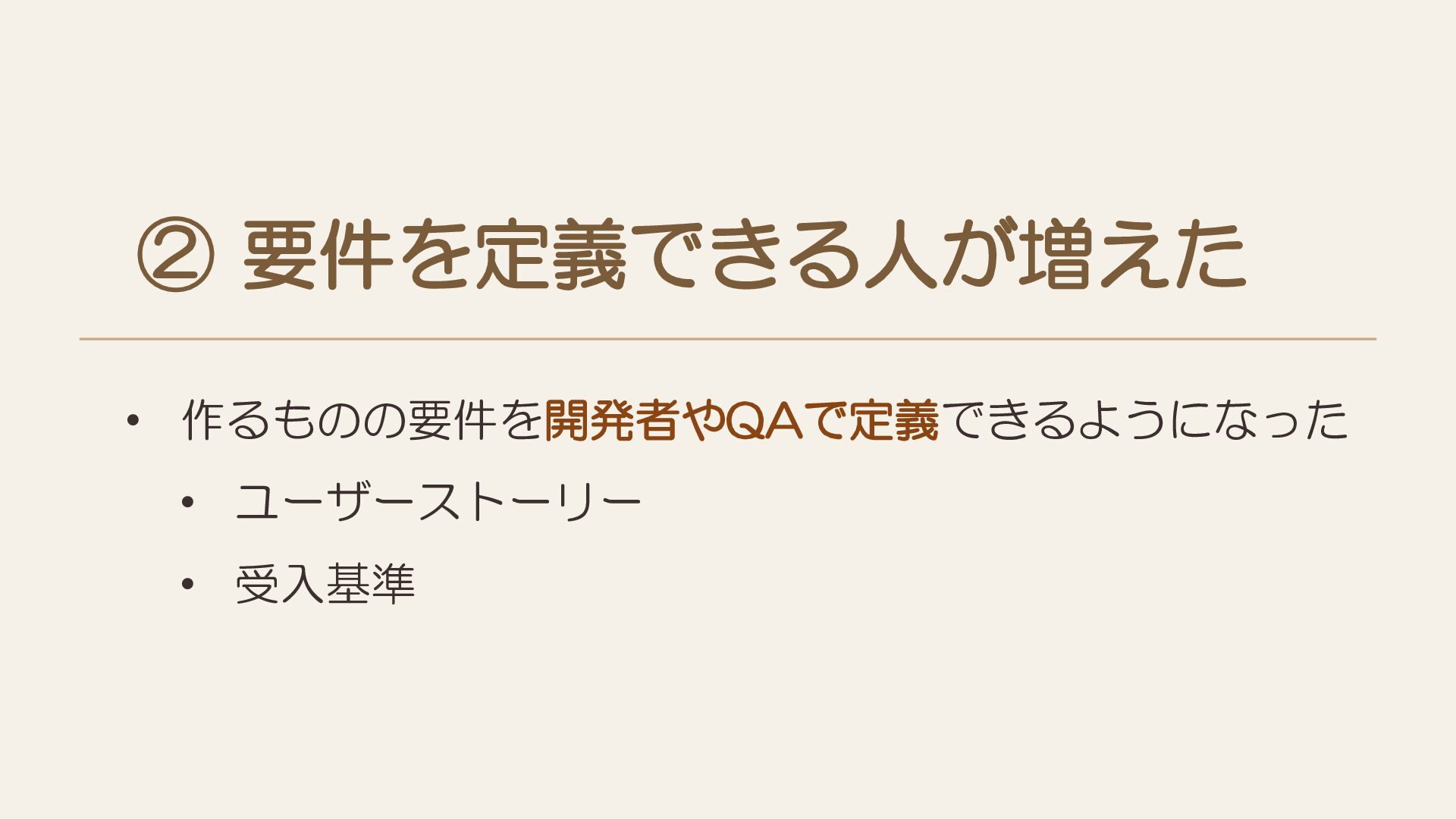 ② 要件を定義できる人が増えた • 作るものの要件を開発者やQAで定義できるようになった • ユーザーストーリー • 受入基準