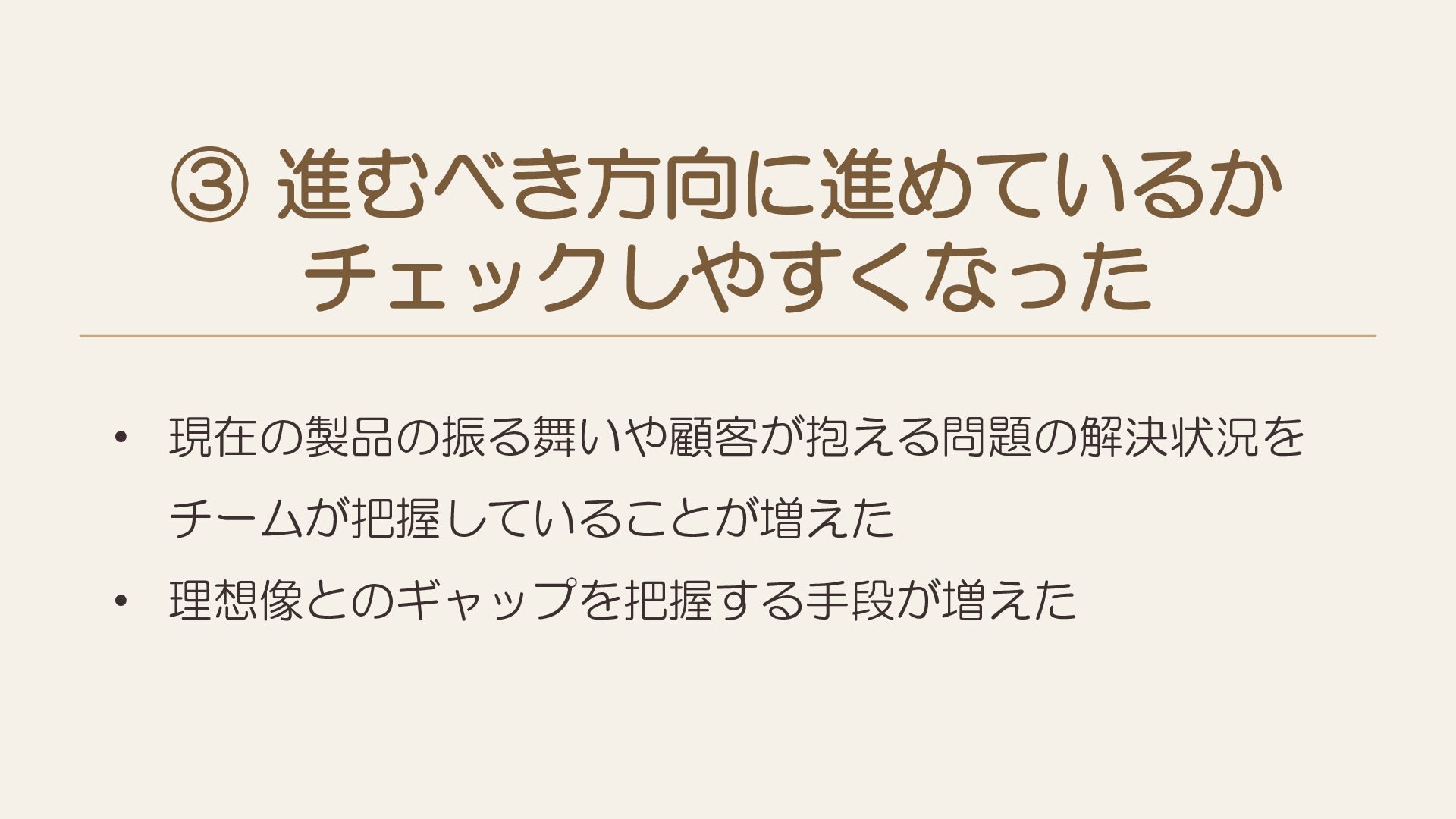 ③ 進むべき方向に進めているか チェックしやすくなった • 現在の製品の振る舞いや顧客が抱える問題の解決状況を チームが把握していることが増えた • 理想像とのギャップを把握する手段が増えた
