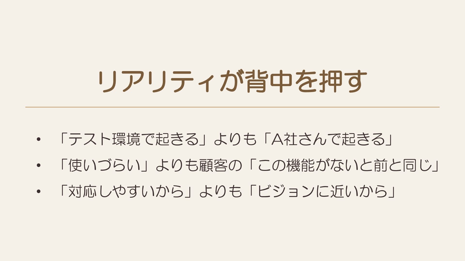 リアリティが背中を押す • 「テスト環境で起きる」よりも「A社さんで起きる」 • 「使いづらい」よりも顧客の「この機能がないと前と同じ」 • 「対応しやすいから」よりも「ビジョンに近いから」