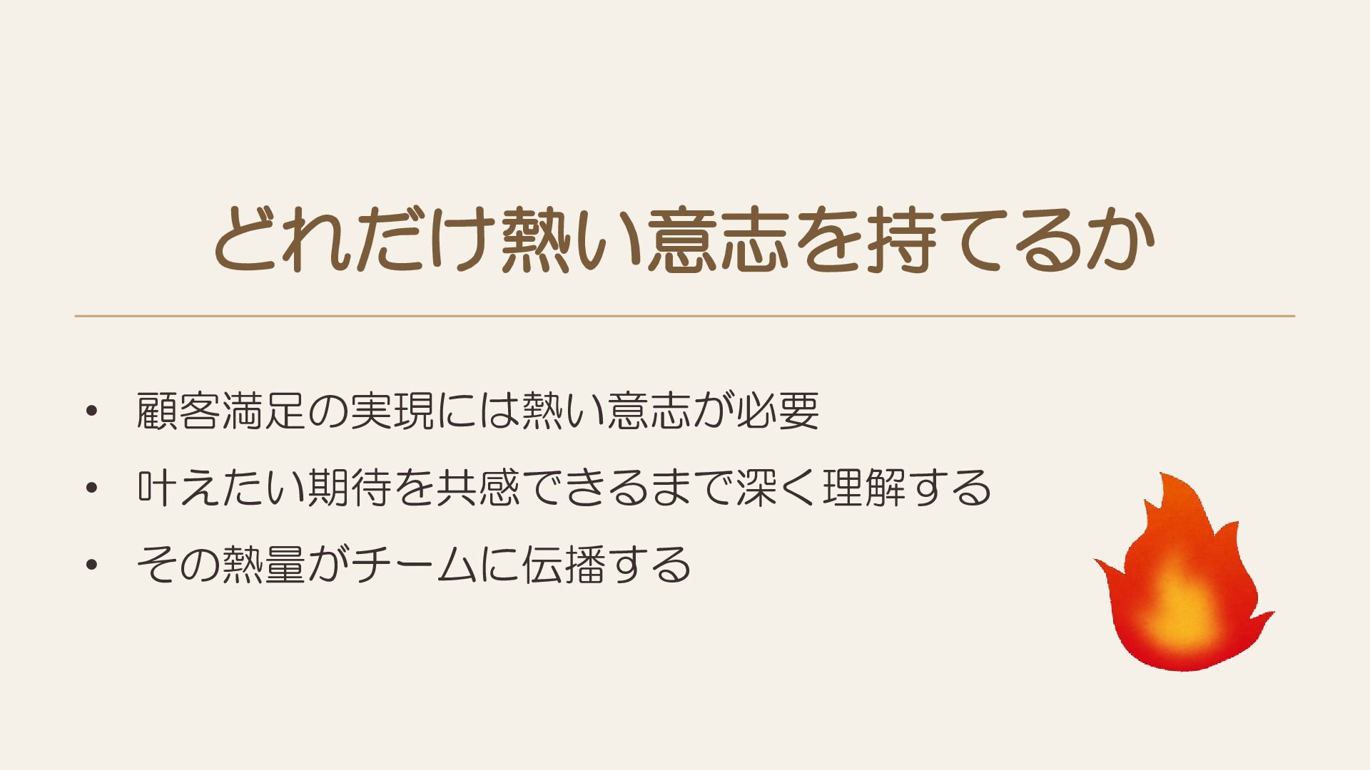 どれだけ熱い意志を持てるか • 顧客満足の実現には熱い意志が必要 • 叶えたい期待を共感できるまで深く理解する • その熱量がチームに伝播する
