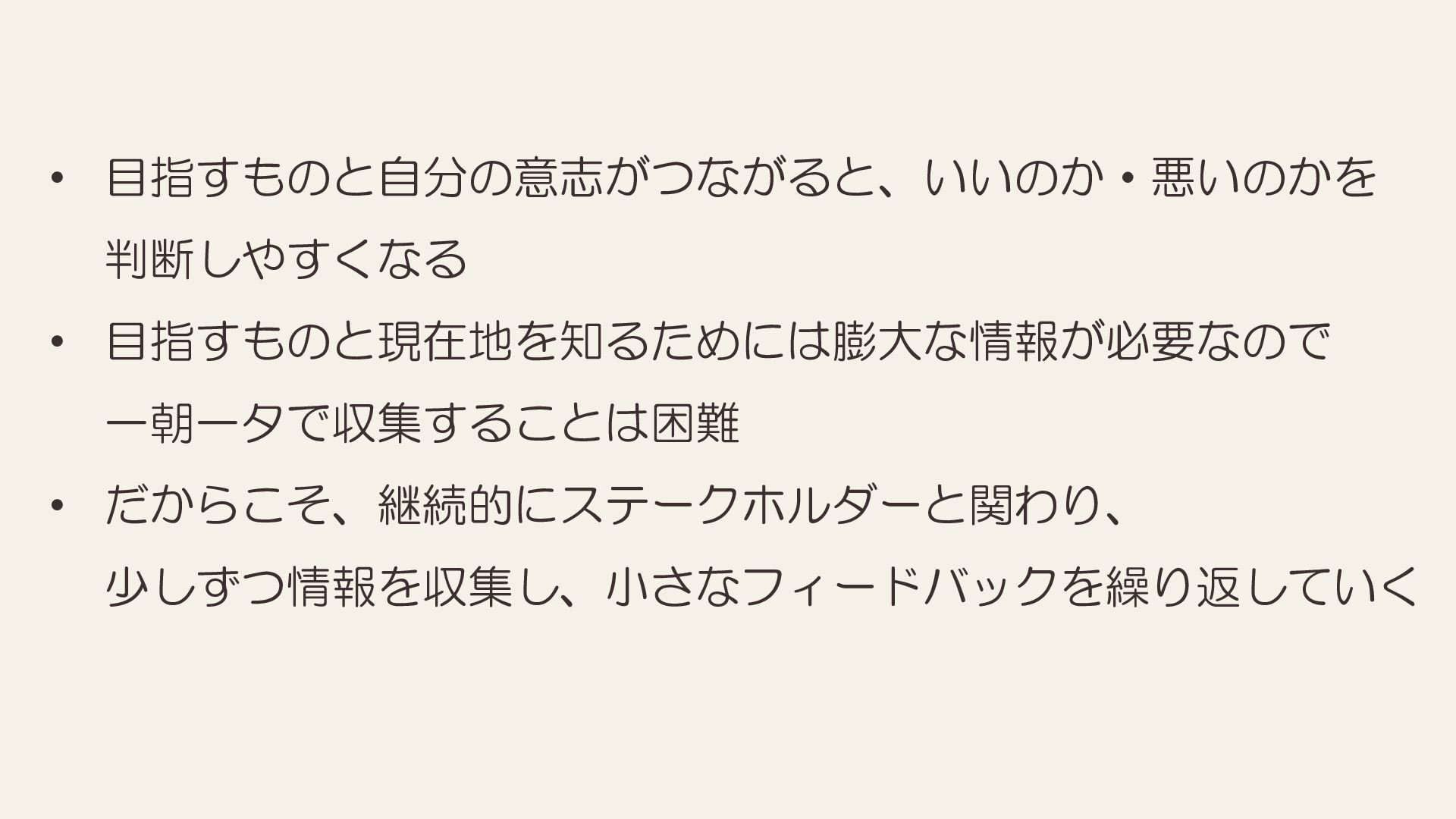 • 目指すものと自分の意志がつながると、いいのか・悪いのかを 判断しやすくなる • 目指すものと現在地を知るためには膨大な情報が必要なので 一朝一夕で収集することは困難 • だからこそ、継続的にステークホルダーと関わり、 少しずつ情報を収集し、小さなフィードバックを繰り返していく
