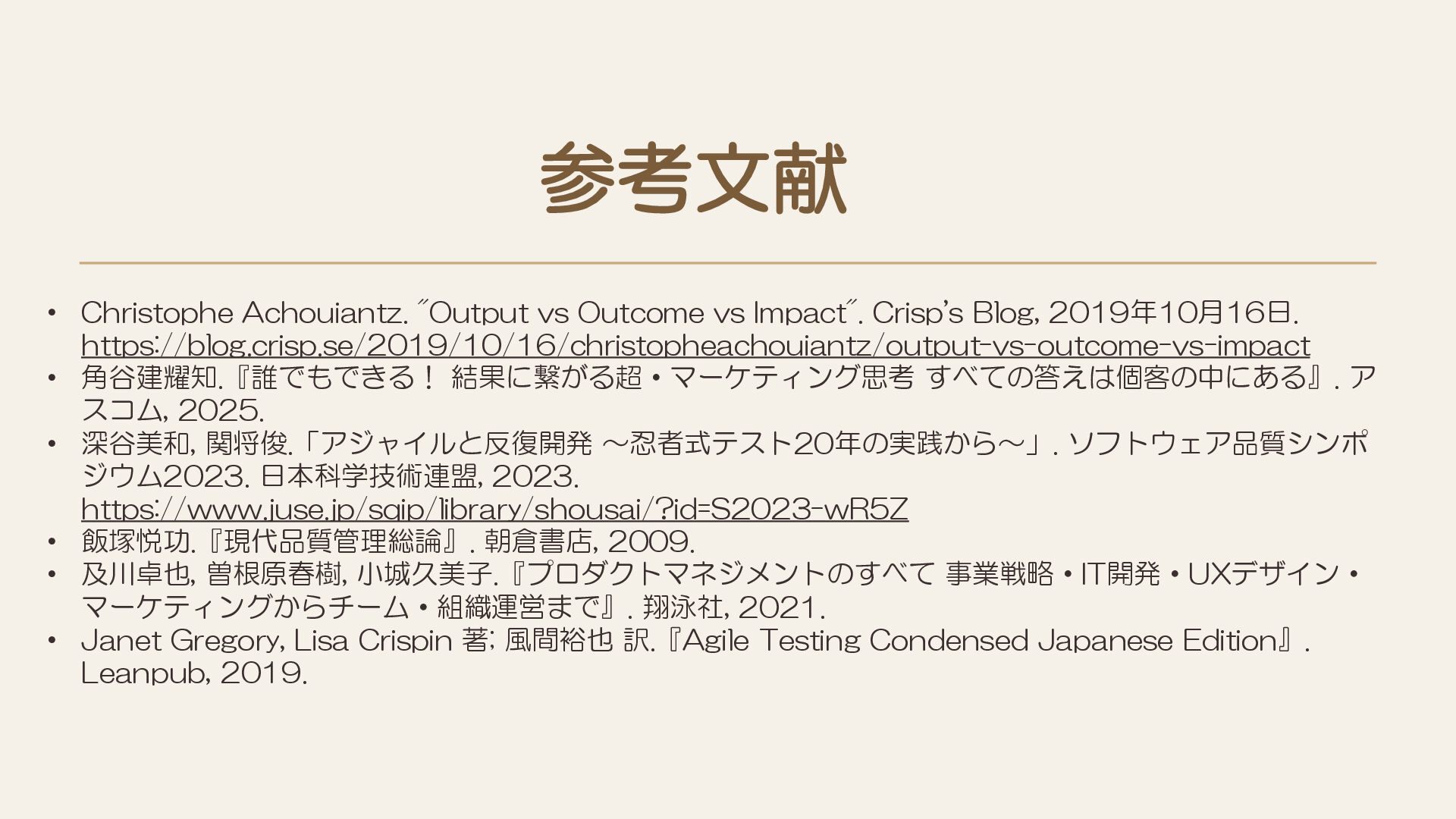 Blog, 2019年10月16日. https://blog.crisp.se/2019/10/16/christopheachouiantz/output-vs-outcome-vs-impact • 角谷建耀知.『誰でもできる! 結果に繋がる超・マーケティング思考 すべての答えは個客の中にある』. ア スコム, 2025. • 深谷美和, 関将俊.「アジャイルと反復開発 ~忍者式テスト20年の実践から~」. ソフトウェア品質シンポ ジウム2023. 日本科学技術連盟, 2023. https://www.juse.jp/sqip/library/shousai/?id=S2023-wR5Z • 飯塚悦功.『現代品質管理総論』. 朝倉書店, 2009. • 及川卓也, 曽根原春樹, 小城久美子.『プロダクトマネジメントのすべて 事業戦略・IT開発・UXデザイン・ マーケティングからチーム・組織運営まで』. 翔泳社, 2021. • Janet Gregory, Lisa Crispin 著; 風間裕也 訳.『Agile Testing Condensed Japanese Edition』. Leanpub, 2019.