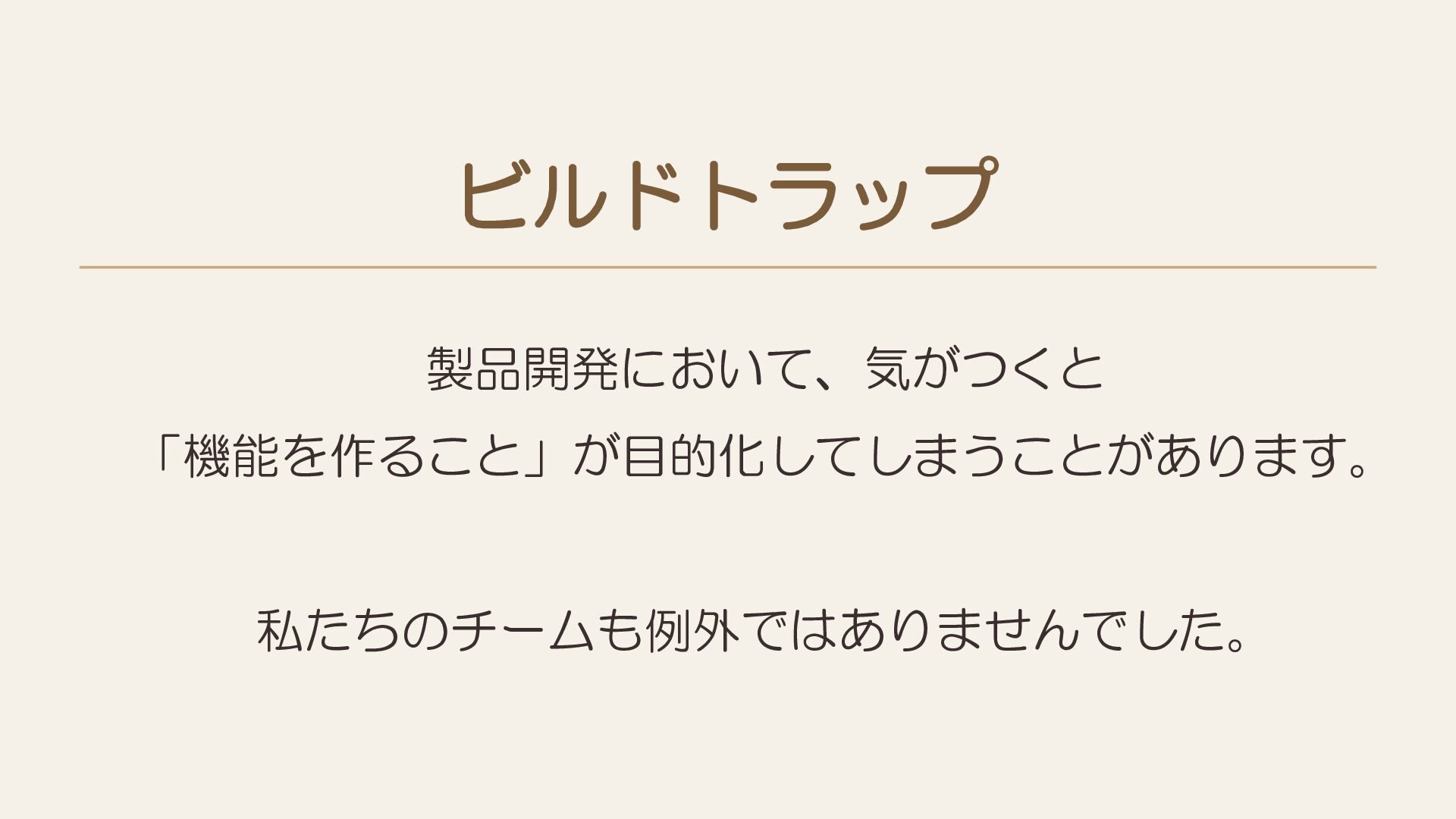 ビルドトラップ 製品開発において、気がつくと 「機能を作ること」が目的化してしまうことがあります。 私たちのチームも例外ではありませんでした。