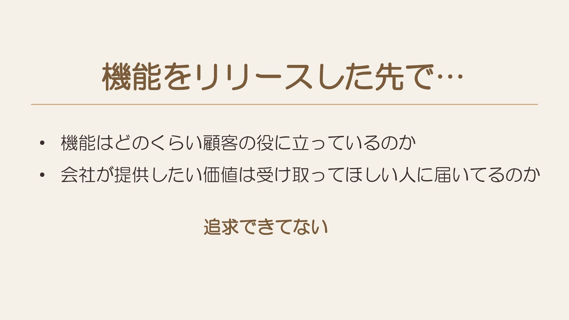 機能をリリースした先で… • 機能はどのくらい顧客の役に立っているのか • 会社が提供したい価値は受け取ってほしい人に届いてるのか 追求できてない