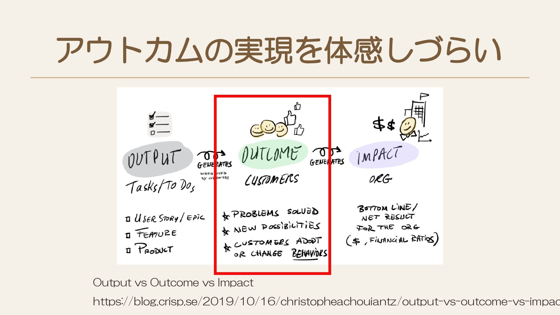 Impact https://blog.crisp.se/2019/10/16/christopheachouiantz/output-vs-outcome-vs-impac アウトカムの実現を体感しづらい