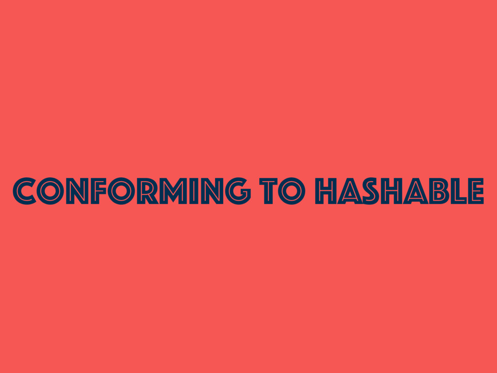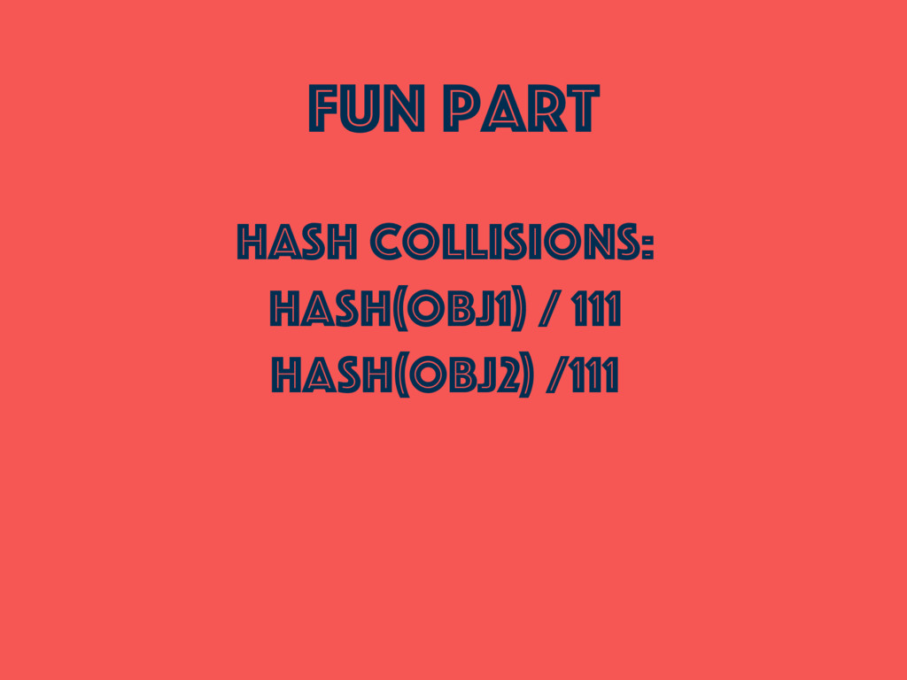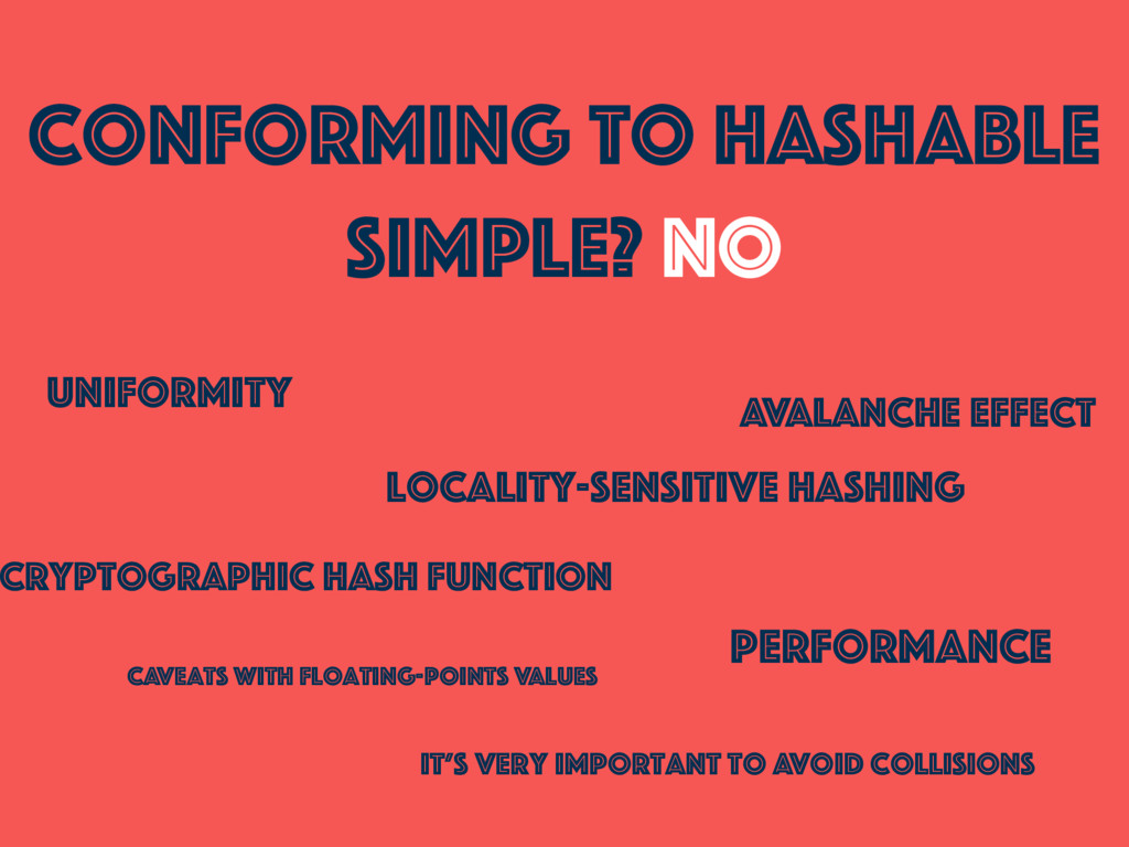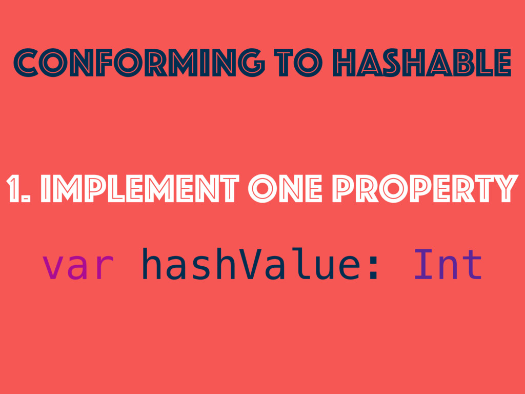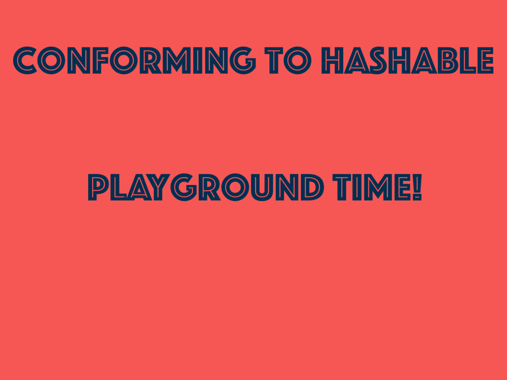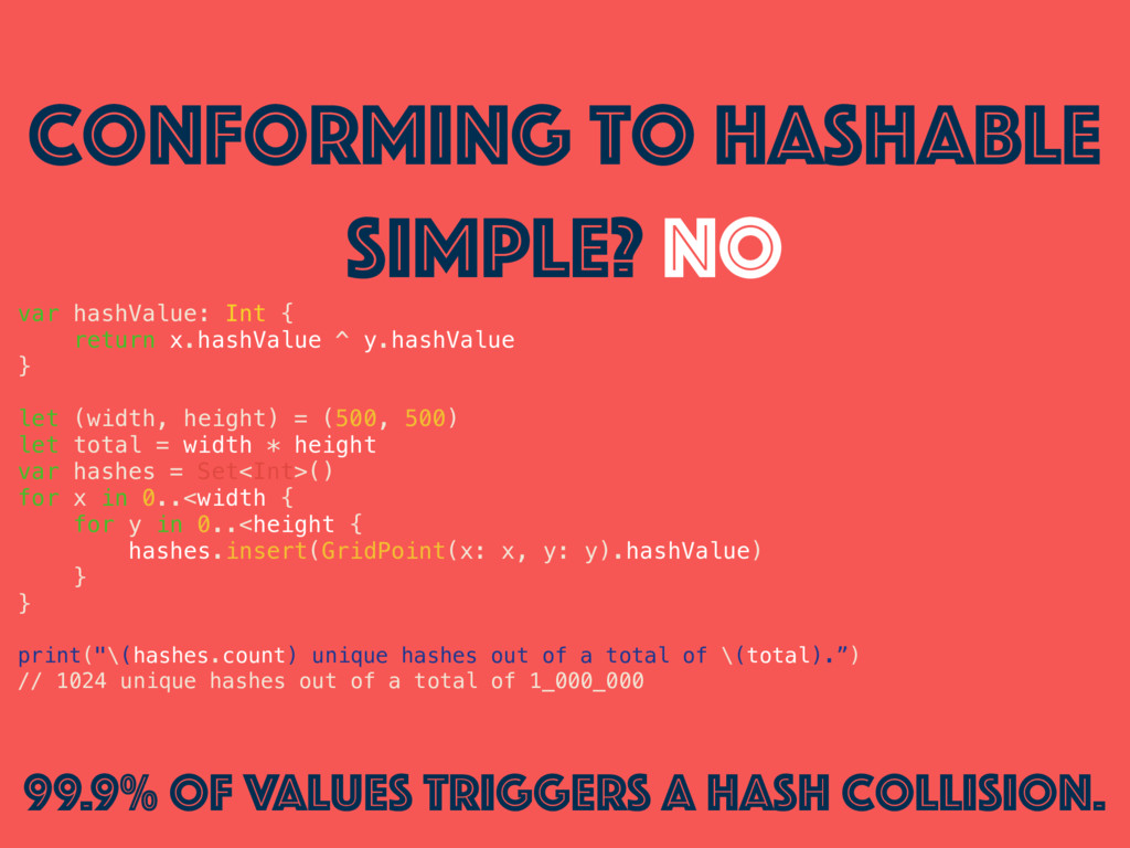 x.hashValue ^ y.hashValue } let (width, height) = (500, 500) let total = width * height var hashes = Set<Int>() for x in 0..<width { for y in 0..<height { hashes.insert(GridPoint(x: x, y: y).hashValue) } } print("\(hashes.count) unique hashes out of a total of \(total).”) // 1024 unique hashes out of a total of 1_000_000 99.9% of values triggers a hash collision.