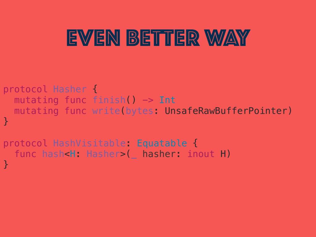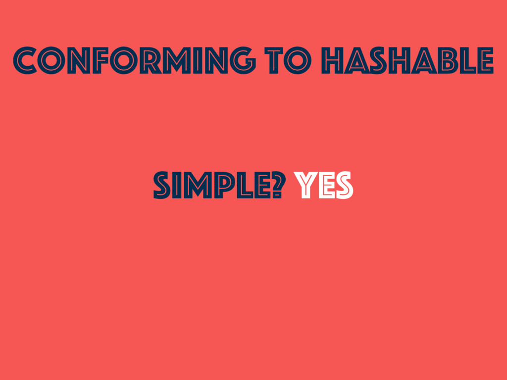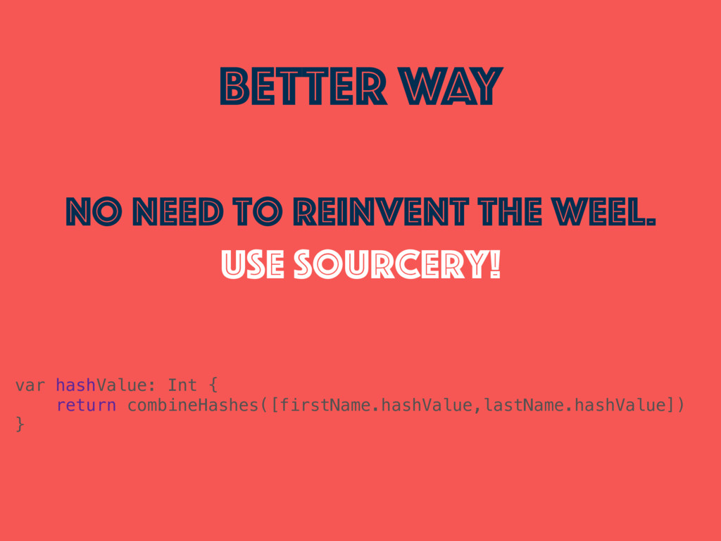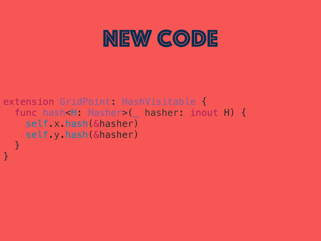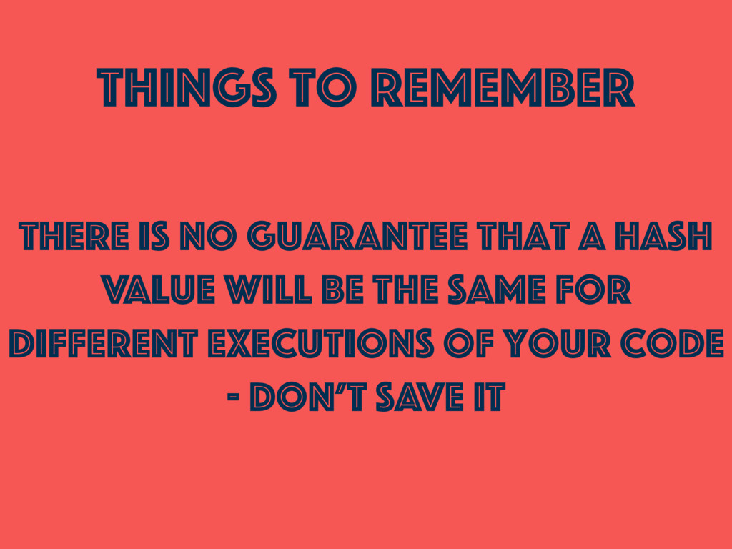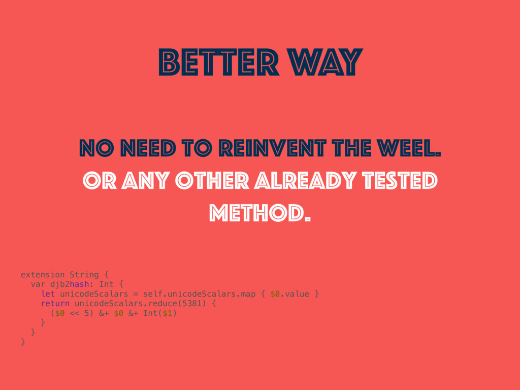 x.hashValue ^ y.hashValue } let (width, height) = (500, 500) let total = width * height var hashes = Set<Int>() for x in 0..<width { for y in 0..<height { hashes.insert(GridPoint(x: x, y: y).hashValue) } } print("\(hashes.count) unique hashes out of a total of \(total).”) // 1024 unique hashes out of a total of 1_000_000 99.9% of values triggers a hash collision.