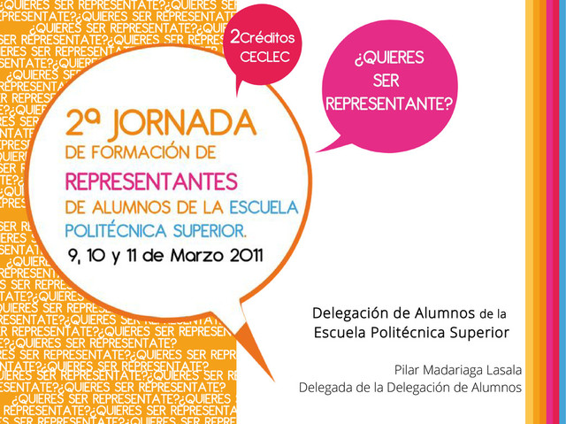 inscribirse en las elecciones al claustro de la EPS) - Ser vocal - Ser coordinador@ de la titulación - Ser secretari@ - Ser tesorer@ - Ser subdelegad@ - Ser delegad@ Importante: Aunque no seas representante puedes venir en cualquier momento a delegación y convertirte en uno :D. 2/2 2ª JORNADA DE FORMACIÓN DE REPRESENTANTES DE ALUMNOS DE LA ESCUELA POLITÉCNICA SUPERIOR