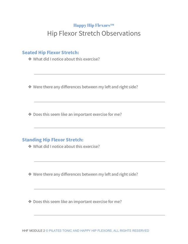 this exercise? ❖ Were there any differences between my left and right side? ❖ Does this seem like an important exercise for me? Supine Hip Flexor Stretch: ❖ What did I notice about this exercise? ❖ Were there any differences between my left and right side? ❖ Does this seem like an important exercise for me? HHF MODULE 2 © PILATES TONIC AND HAPPY HIP FLEXORS, ALL RIGHTS RESERVED