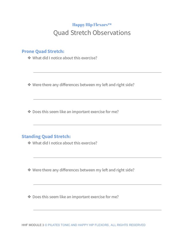 exercise? ❖ Were there any differences between my left and right side? ❖ Does this seem like an important exercise for me? Does one of these exercises need to be added to my Every-Day or weekly exercises? If so, which one? HHF MODULE 3 © PILATES TONIC AND HAPPY HIP FLEXORS, ALL RIGHTS RESERVED
