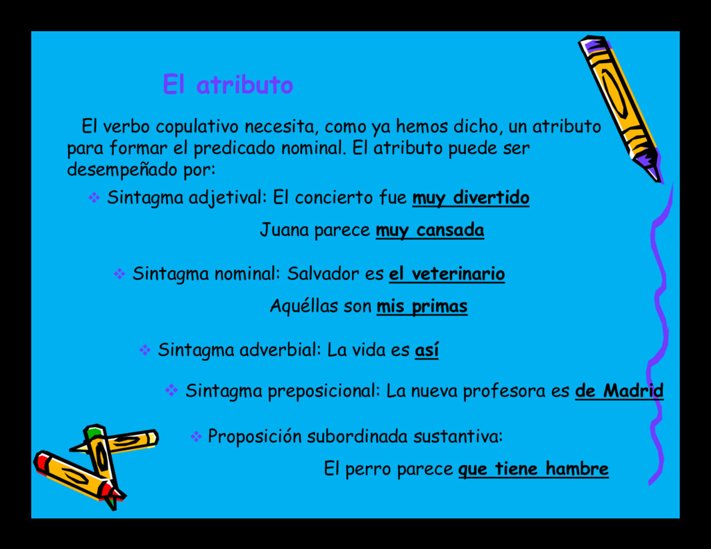 un atributo para formar el predicado nominal. El atributo puede ser desempeñado por: Sintagma adjetival: El concierto fue muy divertido Juana parece muy cansada Sintagma nominal: Salvador es el veterinario Aquéllas son mis primas Sintagma adverbial: La vida es así Sintagma preposicional: La nueva profesora es de Madrid Proposición subordinada sustantiva: El perro parece que tiene hambre