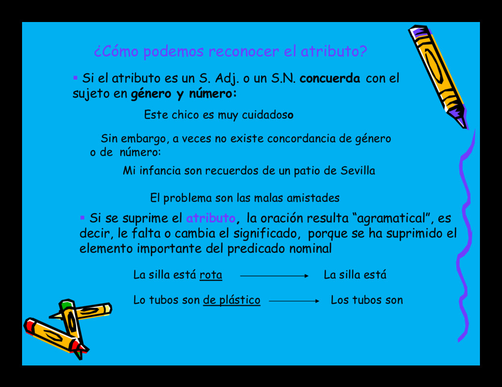 un S. Adj. o un S.N. concuerda con el sujeto en género y número: Este chico es muy cuidadoso Sin embargo, a veces no existe concordancia de género o de número: Mi infancia son recuerdos de un patio de Sevilla El problema son las malas amistades Si se suprime el atributo, la oración resulta “agramatical”, es decir, le falta o cambia el significado, porque se ha suprimido el elemento importante del predicado nominal La silla está rota La silla está Lo tubos son de plástico Los tubos son
