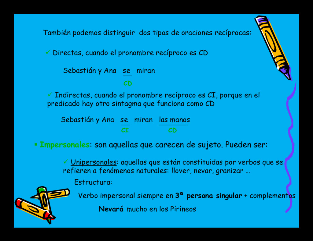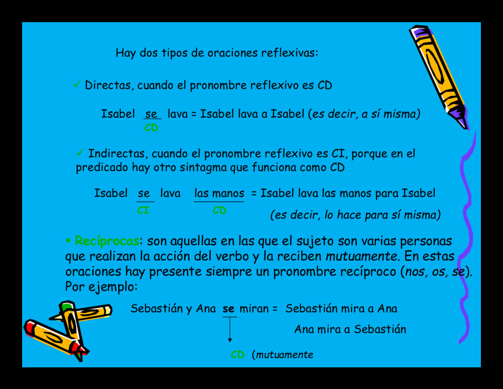 pronombre reflexivo es CD Isabel se lava = Isabel lava a Isabel (es decir, a sí misma) Indirectas, cuando el pronombre reflexivo es CI, porque en el predicado hay otro sintagma que funciona como CD Isabel se lava las manos = Isabel lava las manos para Isabel CD CI CD (es decir, lo hace para sí misma) Recíprocas: son aquellas en las que el sujeto son varias personas que realizan la acción del verbo y la reciben mutuamente. En estas oraciones hay presente siempre un pronombre recíproco (nos, os, se). Por ejemplo: Sebastián y Ana se miran = Sebastián mira a Ana Ana mira a Sebastián CD (mutuamente