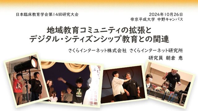 地域教育コミュニティの拡張と デジタル・シティズンシップ教育との関連 さくらインターネット株式会社 さくらインターネット研究所 研究員 朝倉 恵 2024年10月26日 帝京平成大学 中野キャンパス