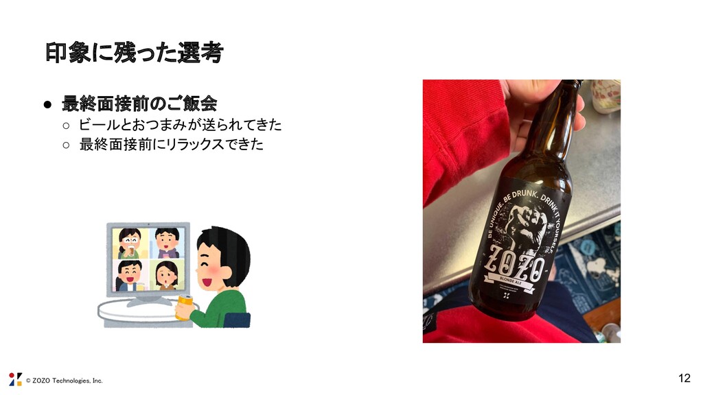 © ZOZO Technologies, Inc. 印象に残った選考 • 最終面接前のご飯会 ◦ ビールとおつまみが送られてきた ◦