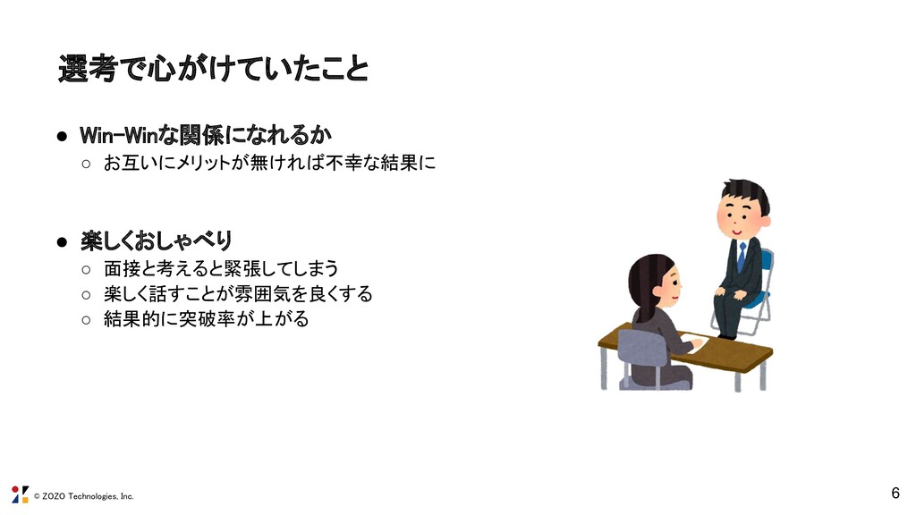 © ZOZO Technologies, Inc. 選考で心がけていたこと • Win-Winな関係になれるか ◦ お互いにメリットが無ければ不幸な結果に