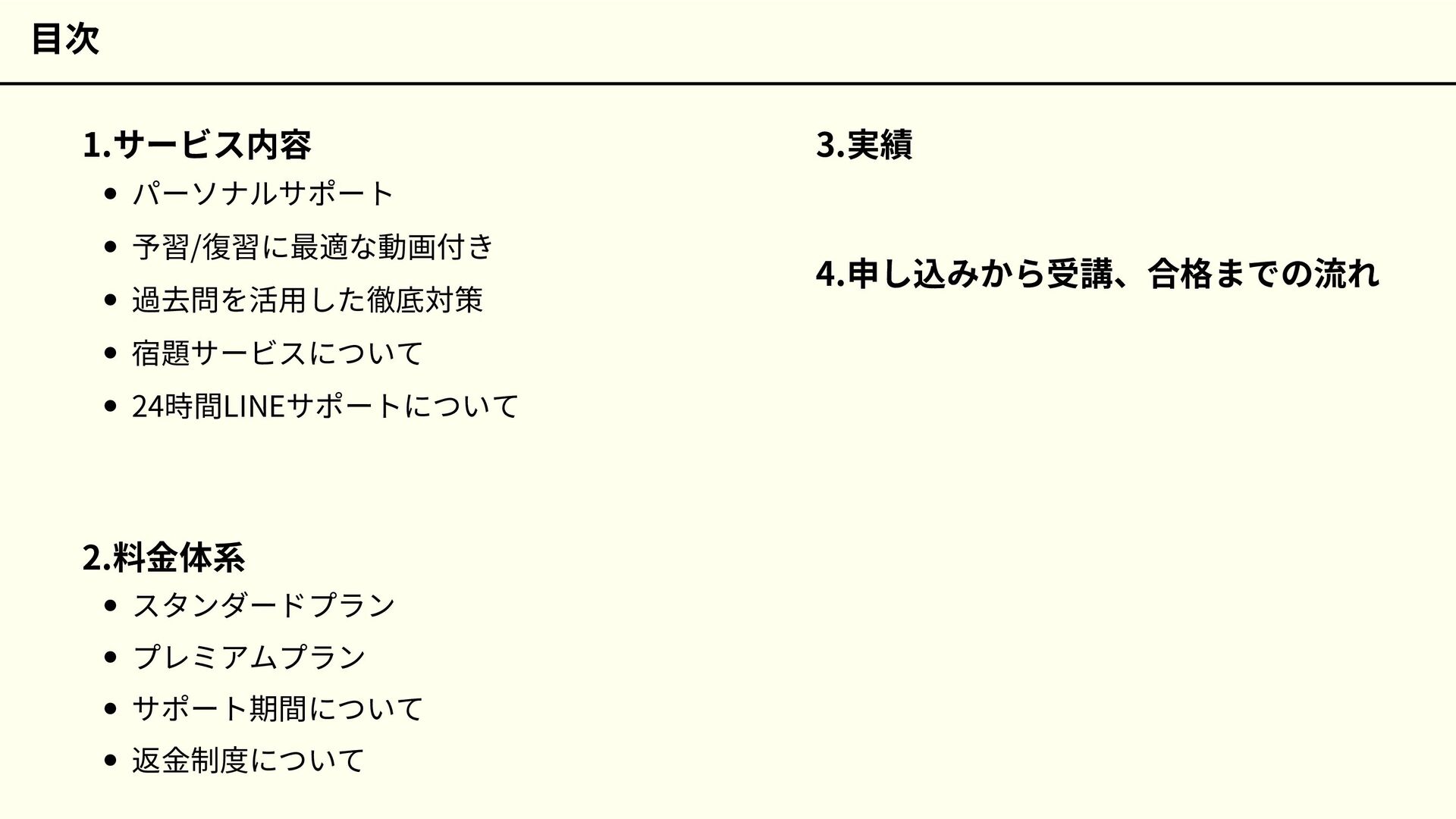 目次 1.サービス内容 パーソナルサポート 予習/復習に最適な動画付き 過去問を活用した徹底対策 宿題サービスについて 24時間LINEサポートについて 2.料金体系 スタンダードプラン プレミアムプラン