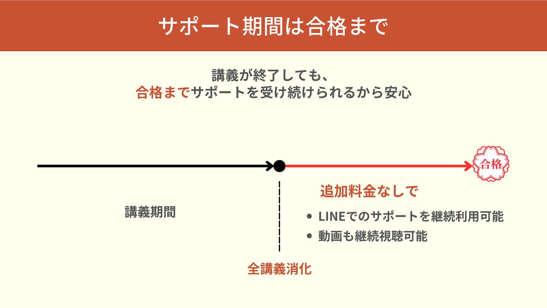 サポート期間は合格まで 講義が終了しても、 合格までサポートを受け続けられるから安心 LINEでのサポートを継続利用可能 動画も継続視聴可能 講義期間 全講義消化 追加料金なしで