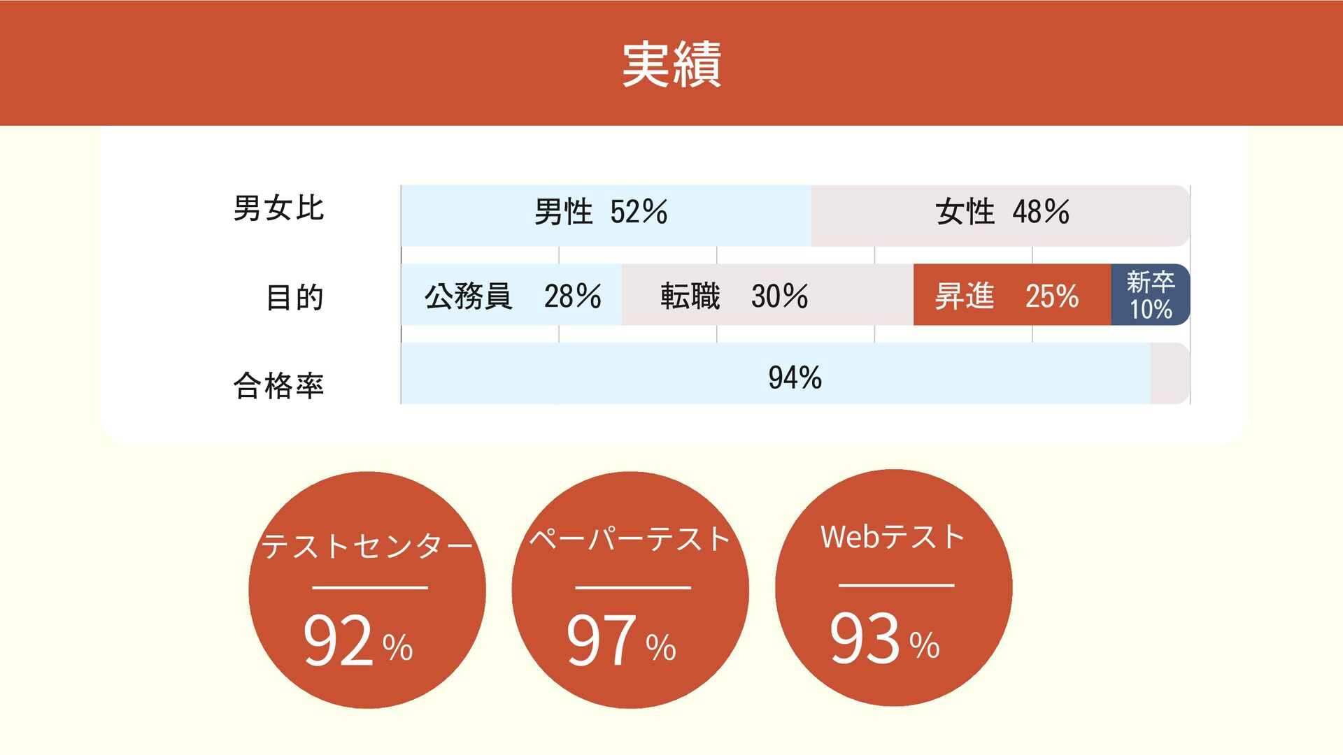 男女比 目的 合格率 男性 52% 女性 48% 公務員 28% 昇進 25% 転職 30%