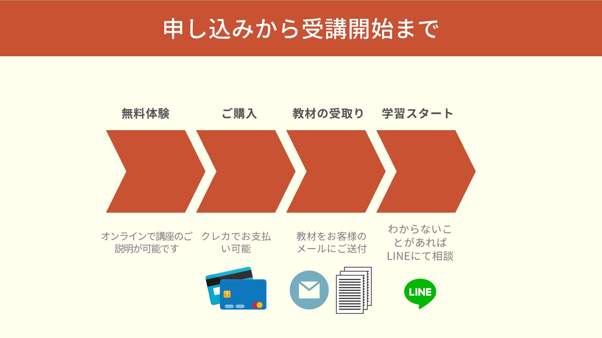 申し込みから受講開始まで オンラインで講座のご 説明が可能です 無料体験 クレカでお支払 い可能 ご購入 教材をお客様の メールにご送付 教材の受取り