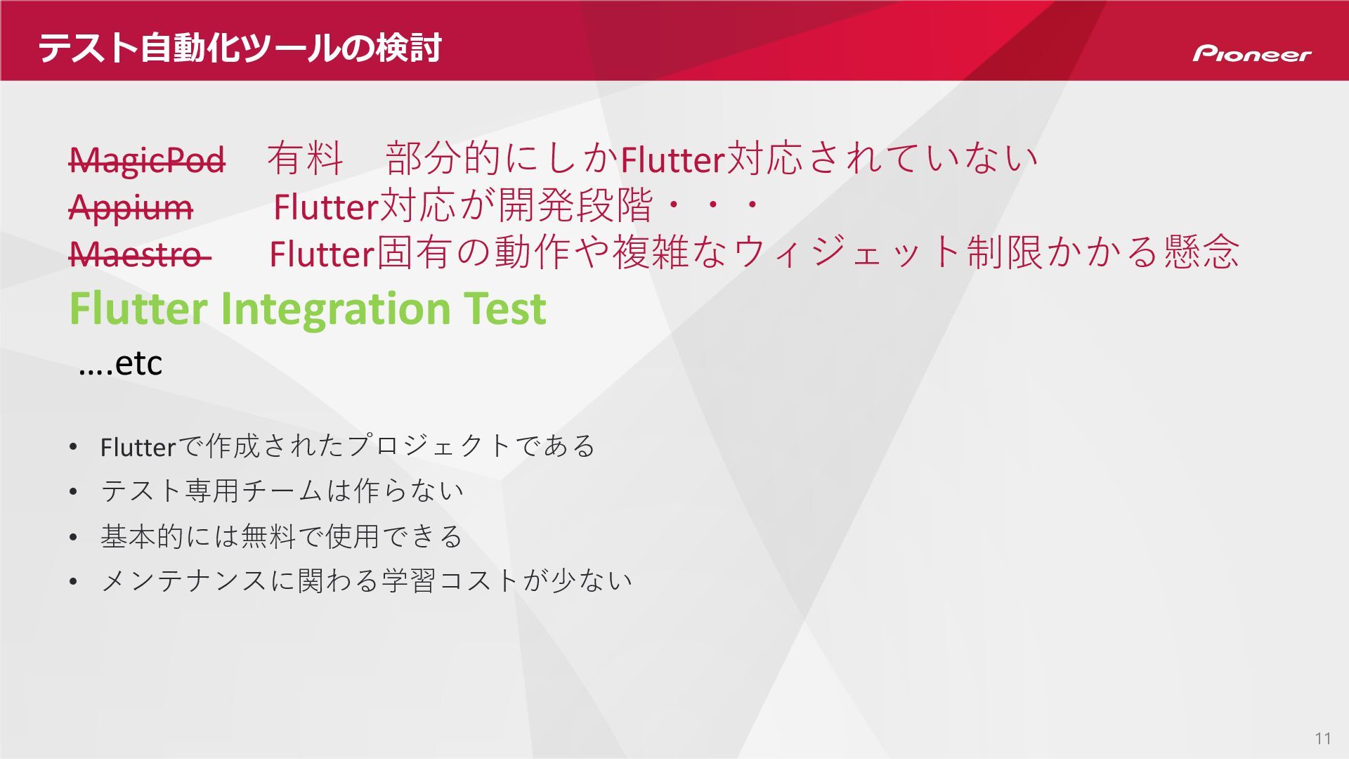 10 テスト⾃動化ツールの検討 MagicPod 有料 部分的にしかFlutter対応されていない Appium Flutter対応が開発段階・・・ Maestro Flutter固有の動作や複雑なウィジェット制限かかる懸念 Flutter