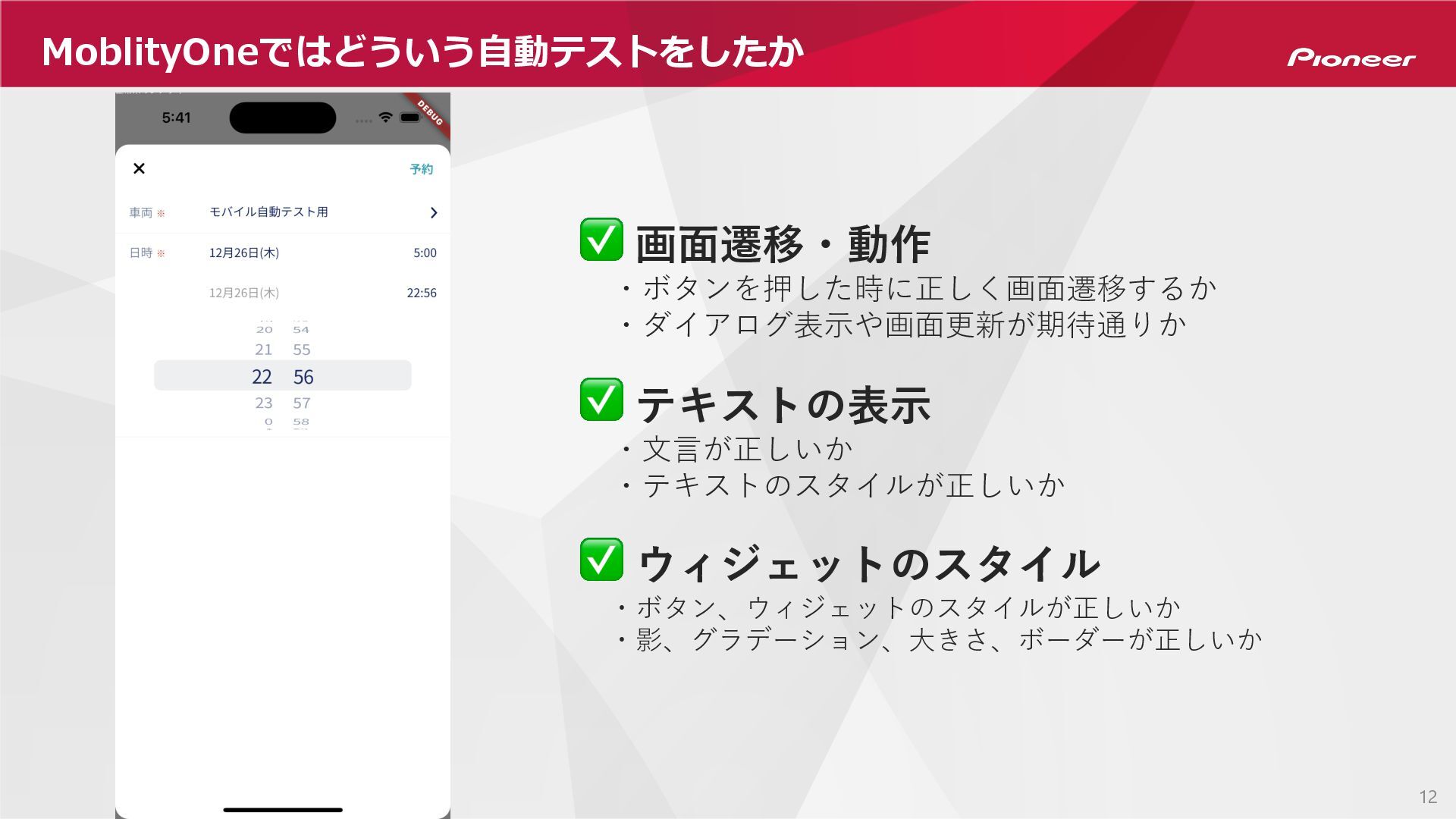 ・ボタン、ウィジェットのスタイルが正しいか ・影、グラデーション、⼤きさ、ボーダーが正しいか 12 MoblityOneではどういう⾃動テストをしたか
