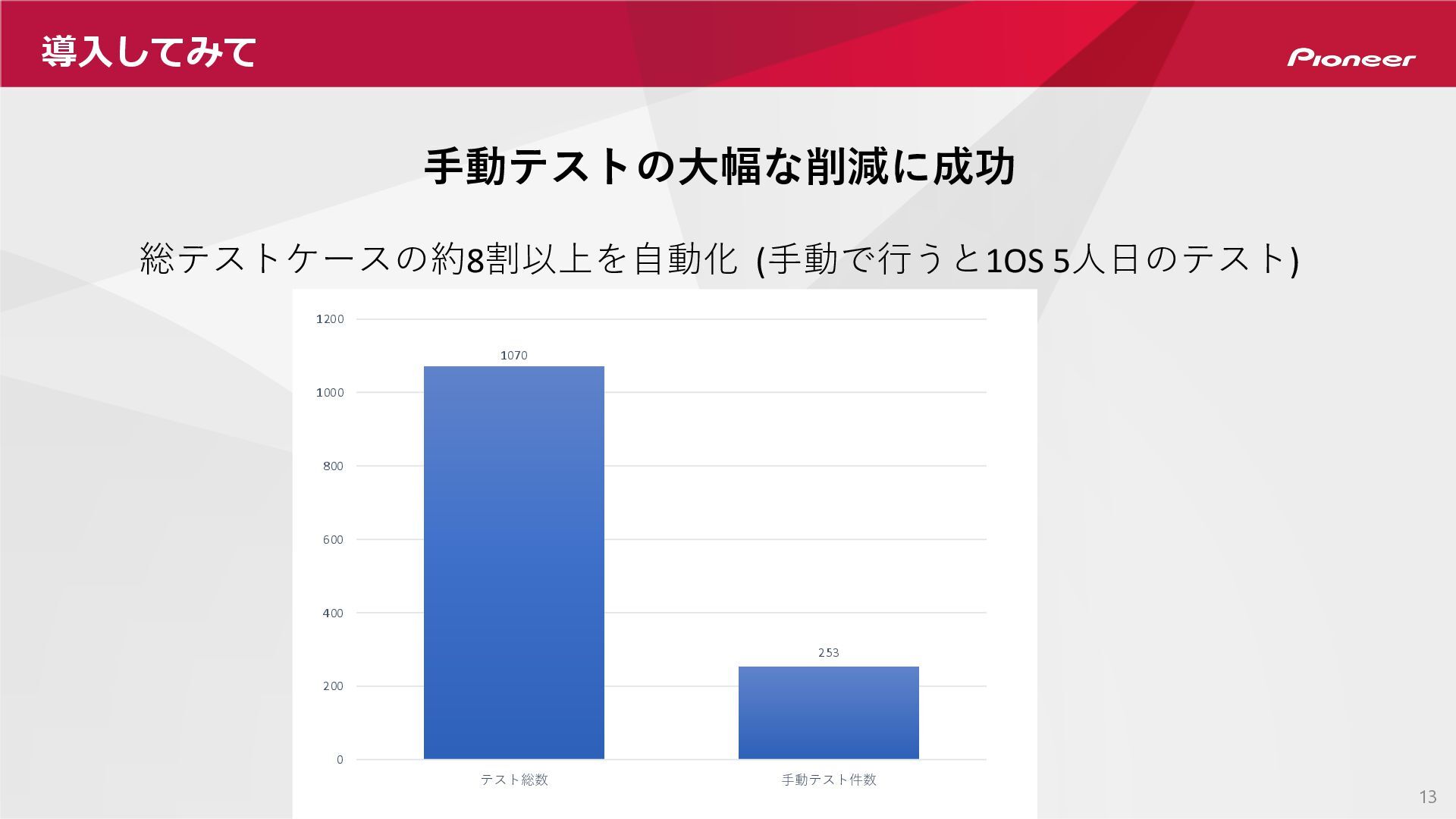 1200 テスト総数 ⼿動テスト件数 ⼿動テストの⼤幅な削減に成功 総テストケースの約8割以上を⾃動化 (⼿動で⾏うと1OS 5⼈⽇のテスト)