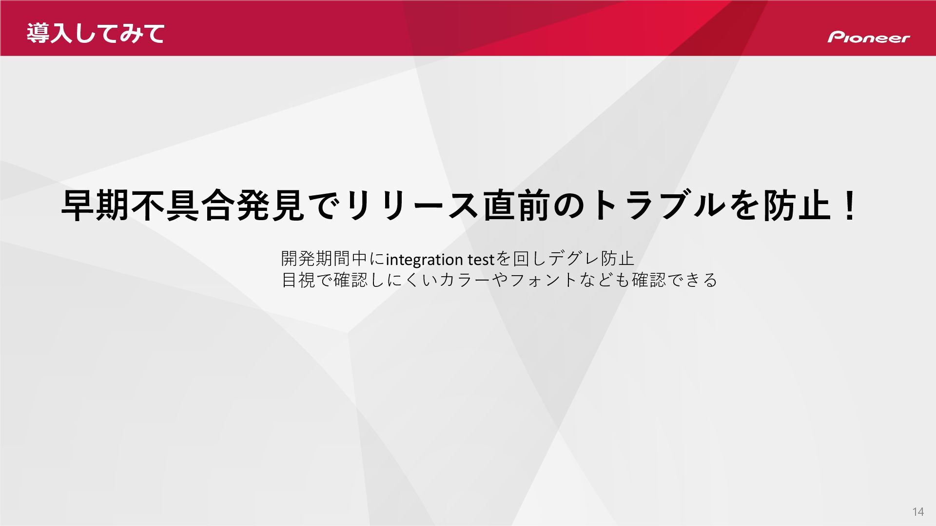 14 導⼊してみて 早期不具合発⾒でリリース直前のトラブルを防⽌! 開発期間中にintegration testを回しデグレ防⽌ ⽬視で確認しにくいカラーやフォントなども確認できる