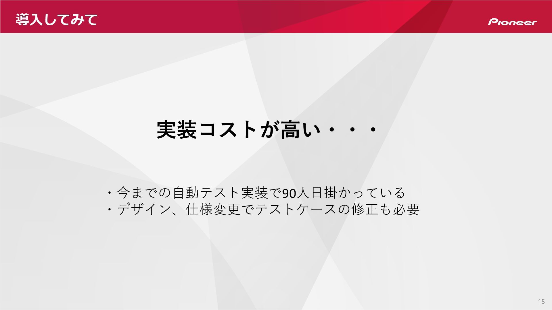 15 導⼊してみて 実装コストが⾼い・・・ ・今までの⾃動テスト実装で90⼈⽇掛かっている ・デザイン、仕様変更でテストケースの修正も必要