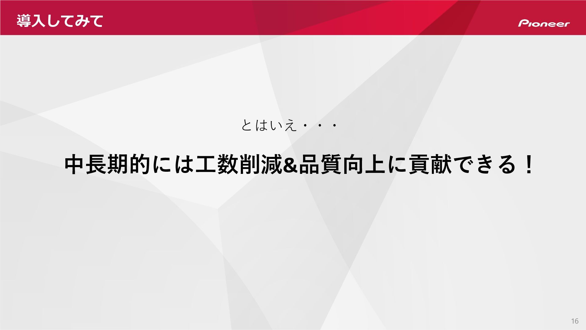 16 導⼊してみて とはいえ・・・ 中⻑期的には⼯数削減&品質向上に貢献できる!