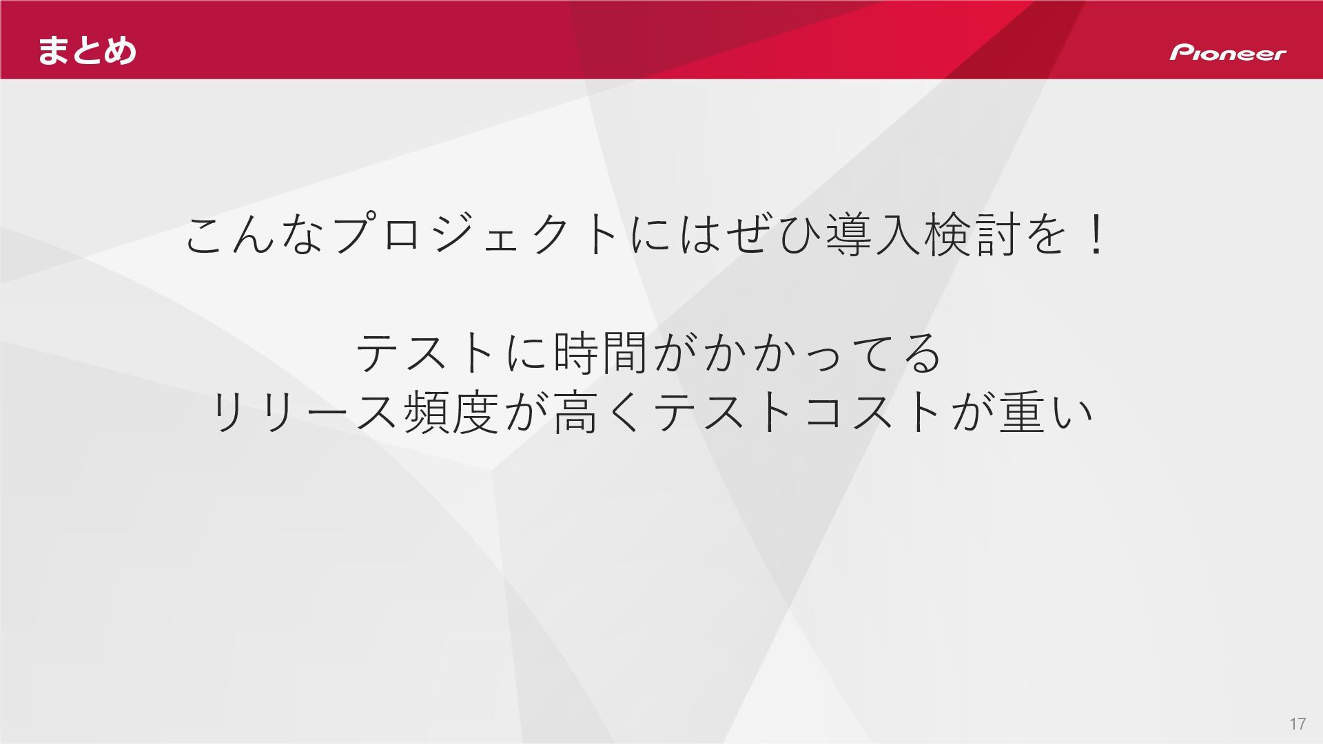 17 まとめ こんなプロジェクトにはぜひ導⼊検討を! テストに時間がかかってる リリース頻度が⾼くテストコストが重い