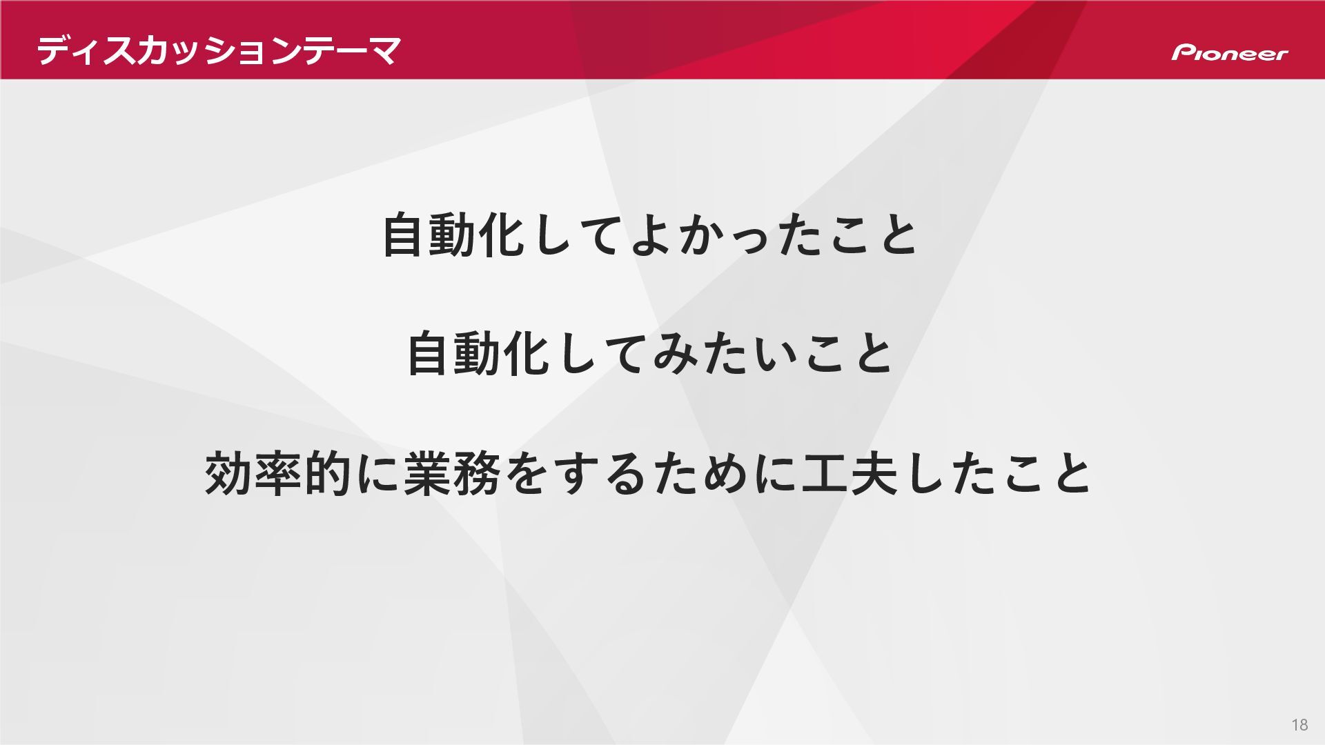 18 ディスカッションテーマ ⾃動化してよかったこと ⾃動化してみたいこと 効率的に業務をするために⼯夫したこと