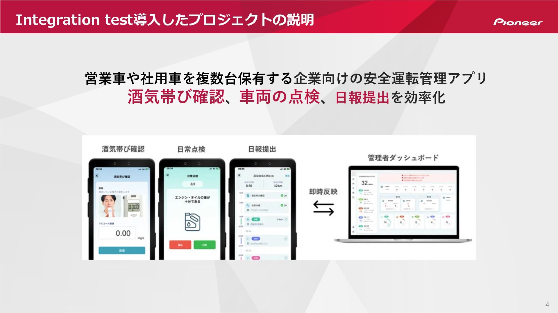 営業⾞や社⽤⾞を複数台保有する企業向けの安全運転管理アプリ 酒気帯び確認、⾞両の点検、⽇報提出を効率化 4 Integration test導⼊したプロジェクトの説明