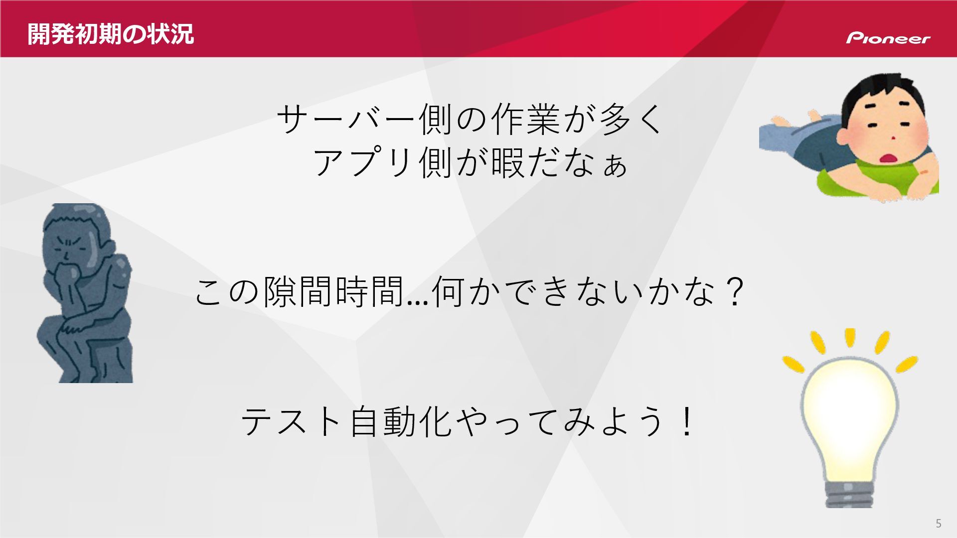 5 開発初期の状況 サーバー側の作業が多く アプリ側が暇だなぁ この隙間時間…何かできないかな? テスト⾃動化やってみよう!