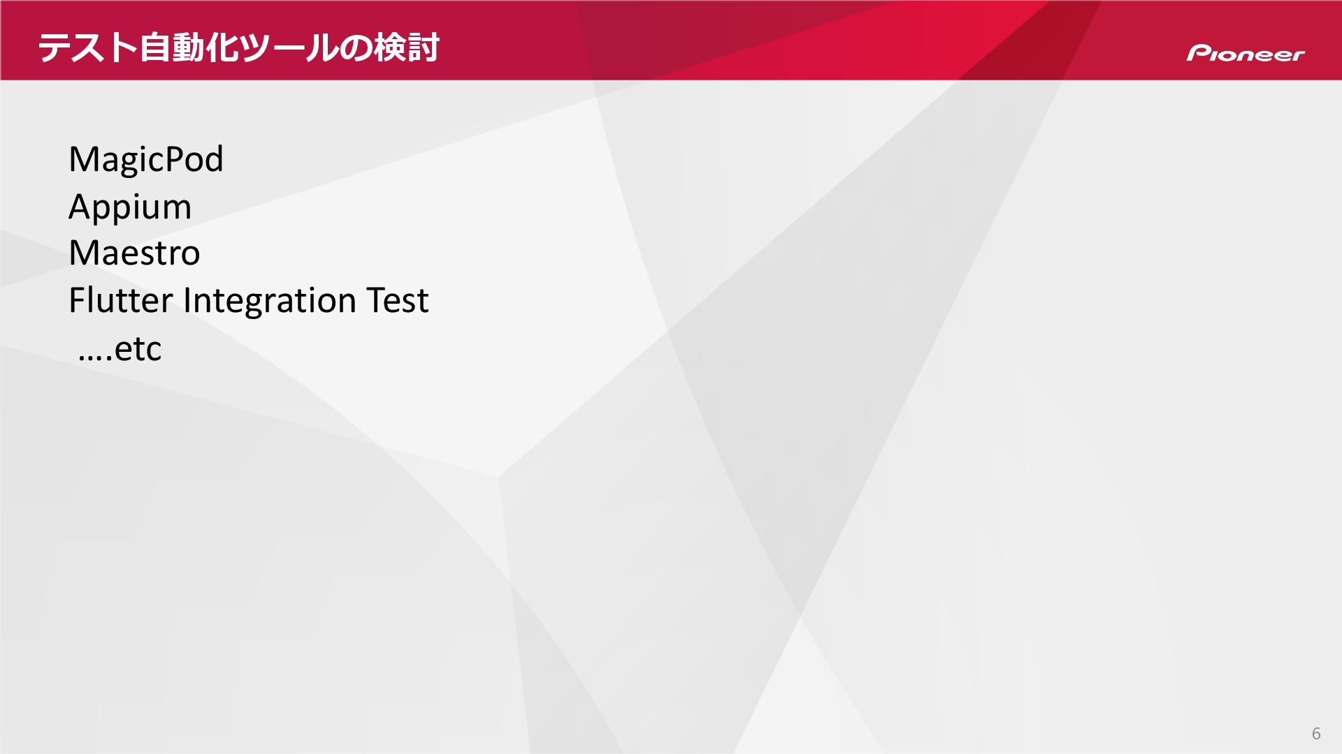 6 テスト⾃動化ツールの検討 MagicPod Appium Maestro Flutter Integration Test ….etc