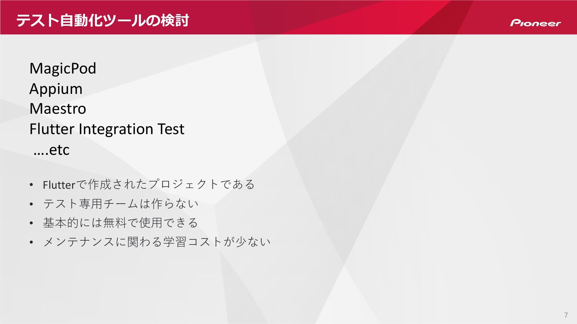 7 テスト⾃動化ツールの検討 MagicPod Appium Maestro Flutter Integration Test ….etc •