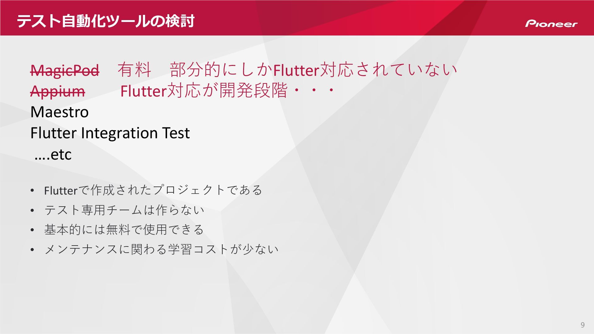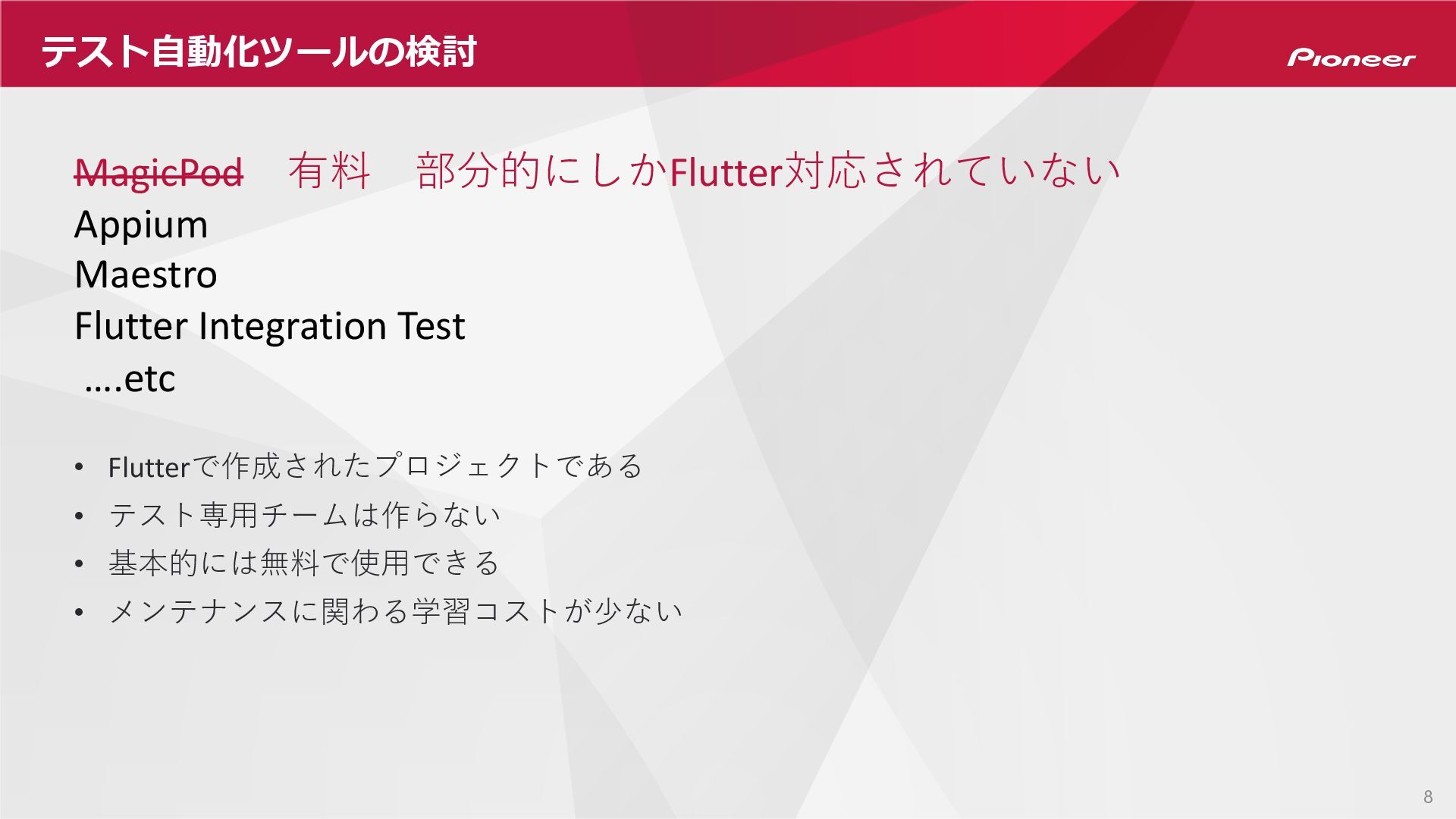 8 テスト⾃動化ツールの検討 MagicPod 有料 部分的にしかFlutter対応されていない Appium Maestro Flutter Integration Test